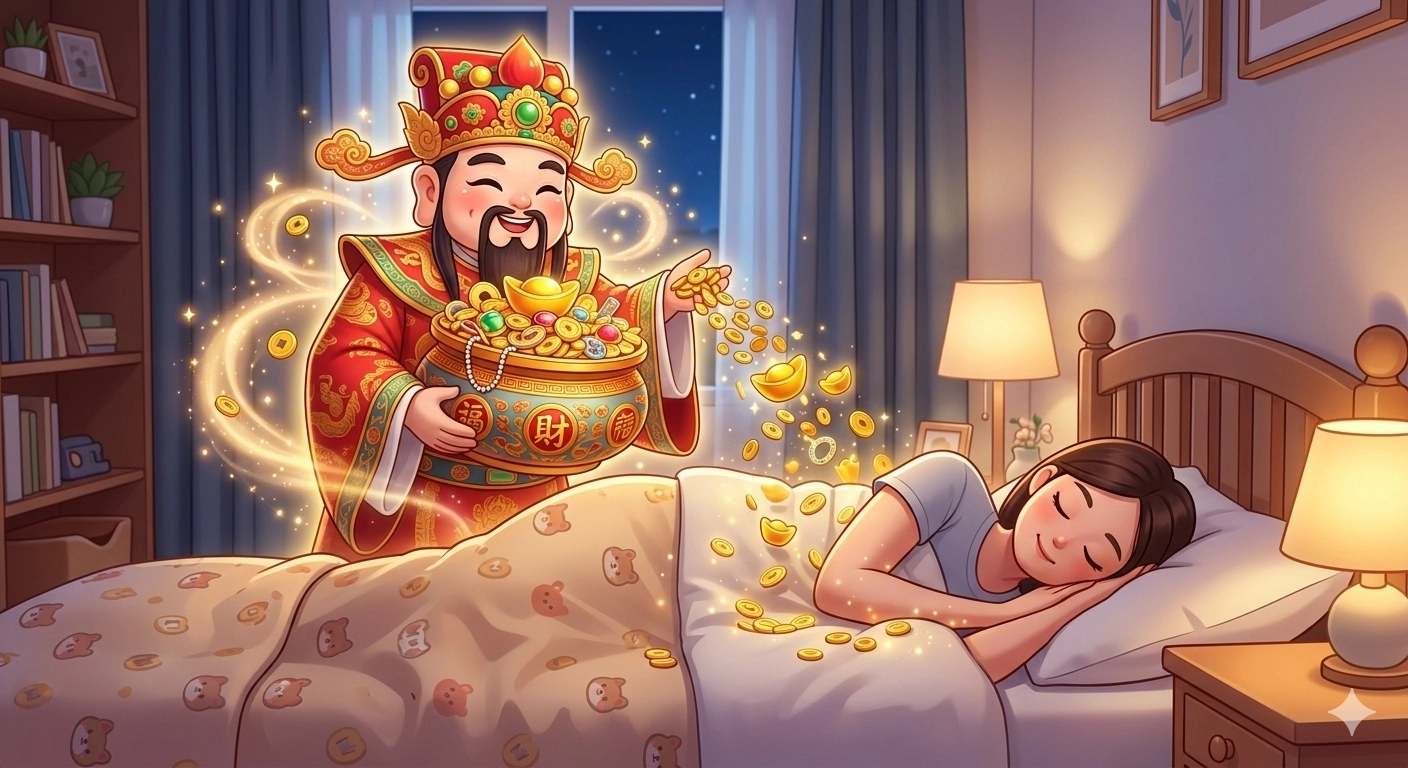 告訴Gemini要一張財神爺抱著聚寶盆來到我的夢裡賜與我金銀財寶,帶給我財運的照片並指定時間和地點,