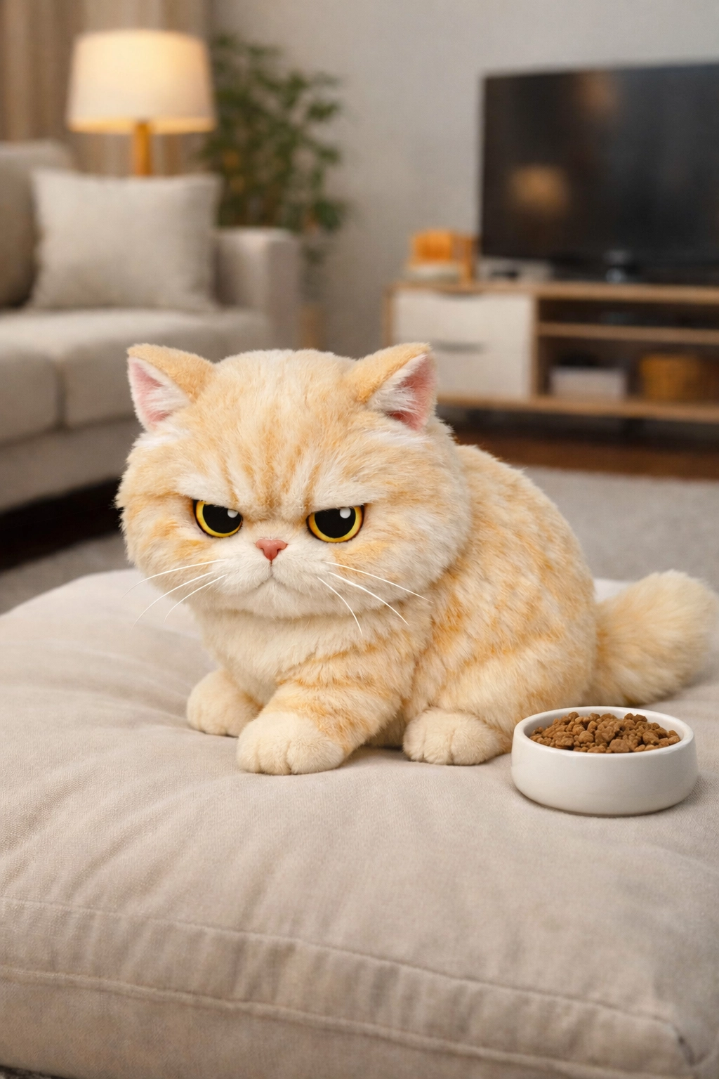 請用我給的原圖,做一張立體公仔圖,背景我想要在客廳裡然後貓咪在軟墊上,軟墊旁邊有一個飼料碗