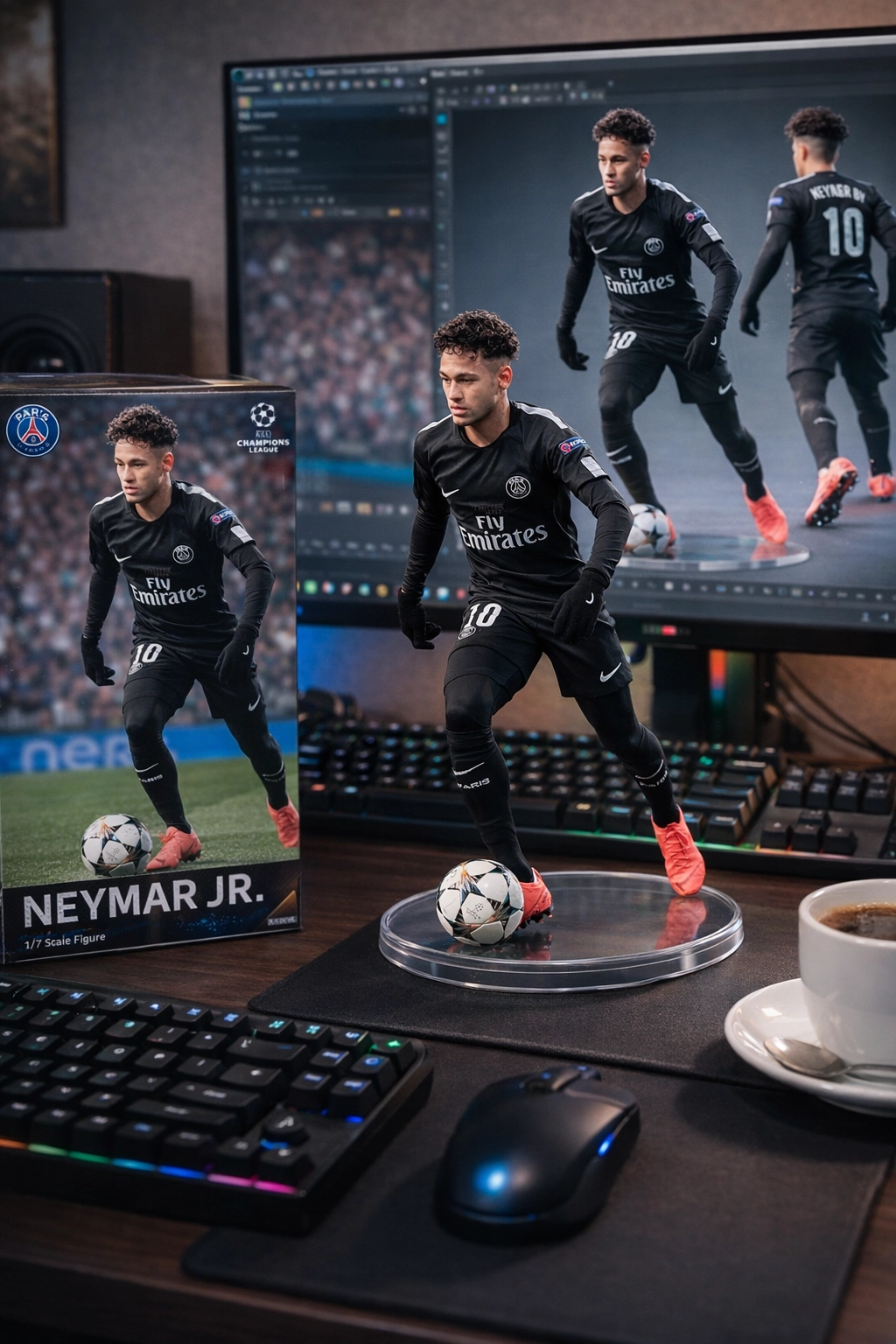 桌面上另外放置了鍵盤、滑鼠、咖啡杯,以及其模型盒,設計為市售收藏品風格,正面印有該角色的彩色動漫插圖,呈現完整的周邊商品氛圍。