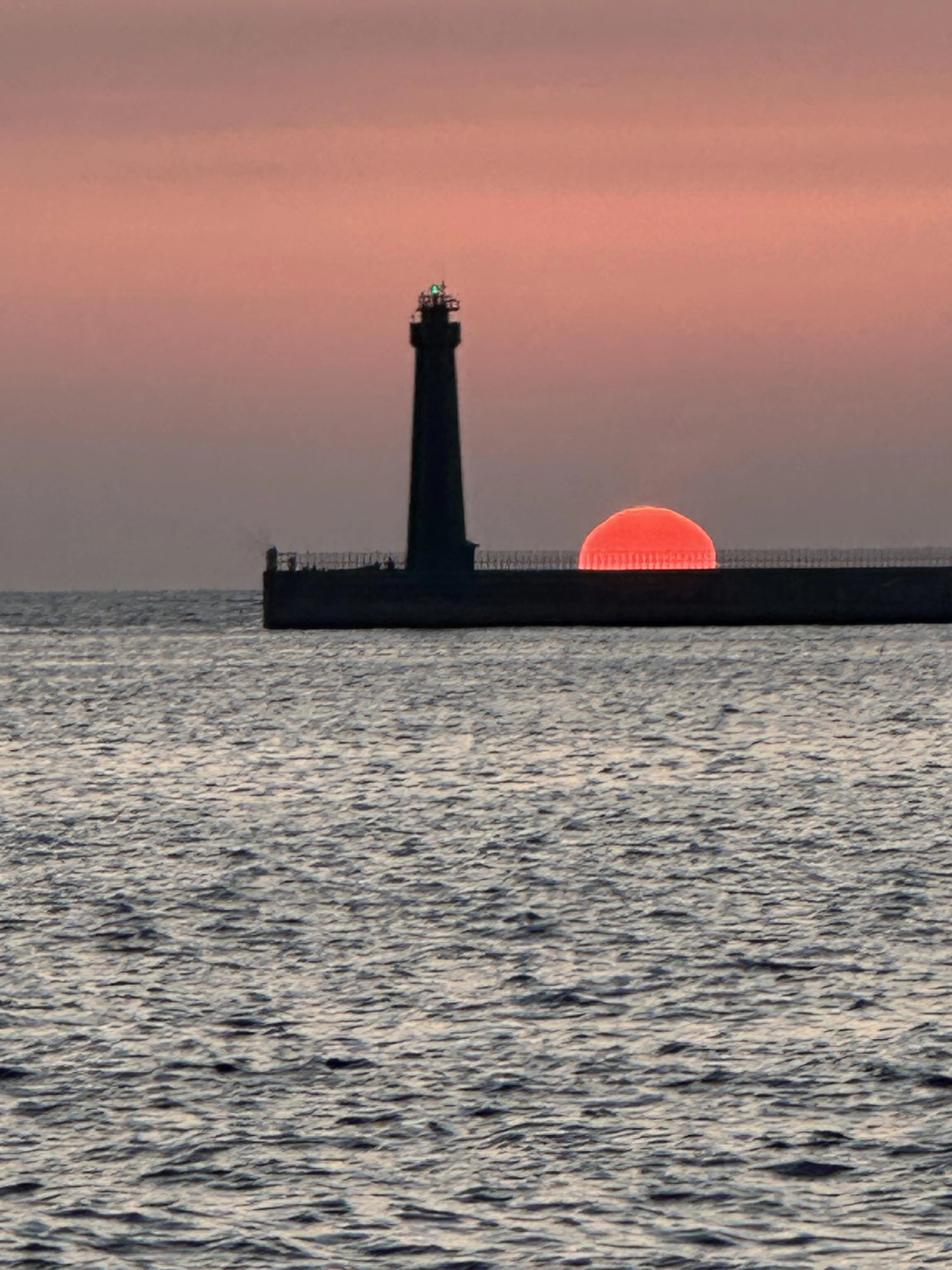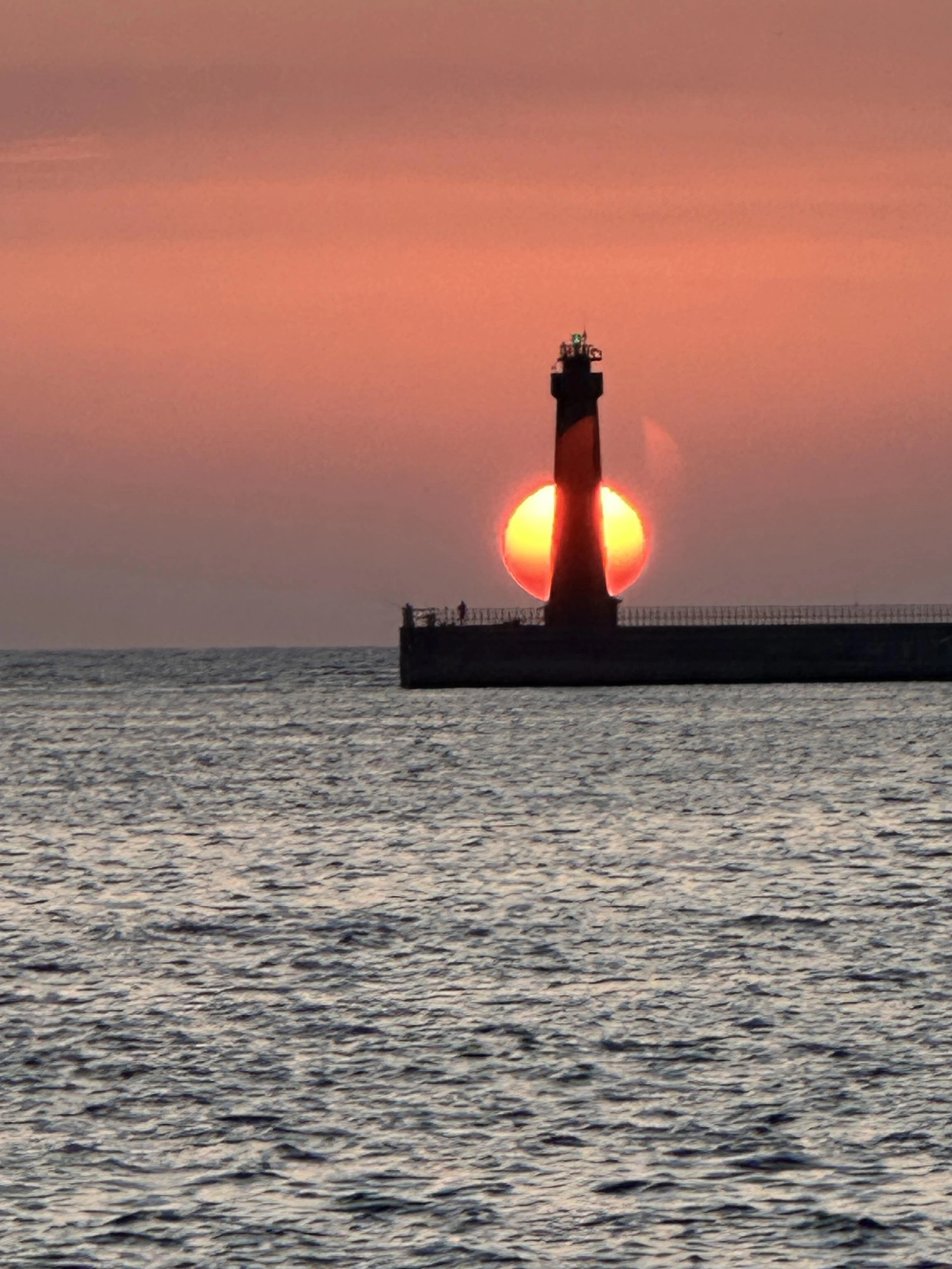 港口左紅右綠的兩盞燈在夕陽餘暉中早已亮起,為進出港的船隻指引方向,無聲守護著漁民的安全。