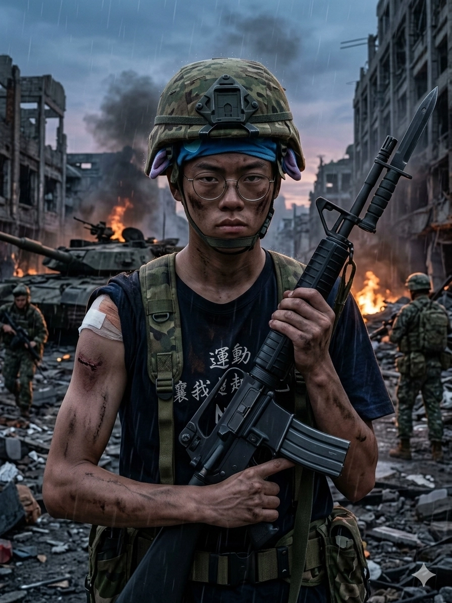 請幫我把這位同學變換到戰場上,拿著槍、戴頭盔、臉嚴肅,背景黑一點