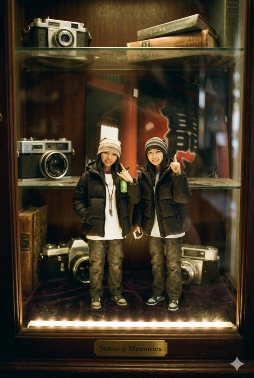 請幫我使用上述兩個人物製成公仔 放在櫥櫃裡面 底下加上燈條營造打光的感覺 要有復古感