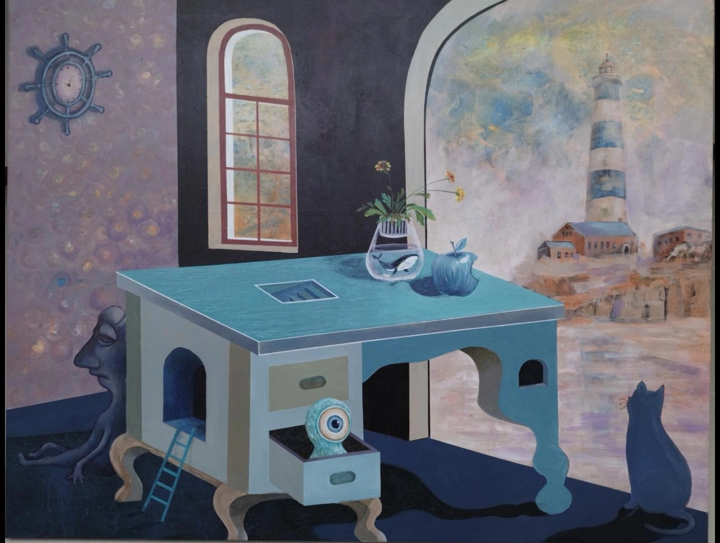 這是描繪一個在意識與記憶之間緩慢流動的內在景觀。室內的桌子、抽屜裡凝視的眼、靜坐的貓與遠方的燈塔,並