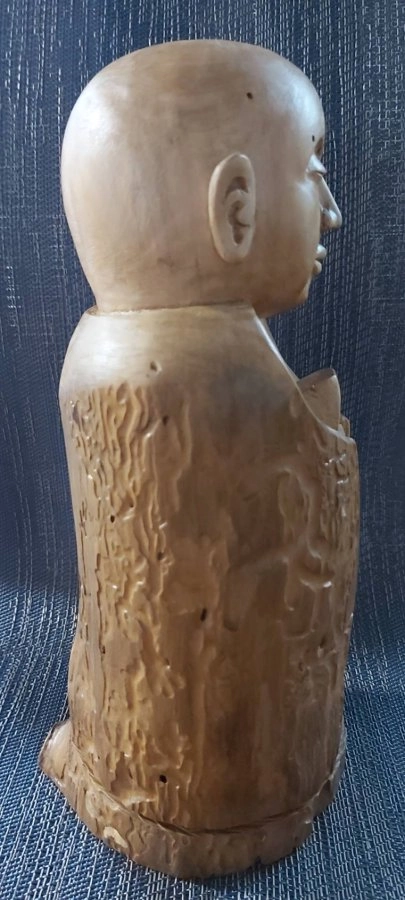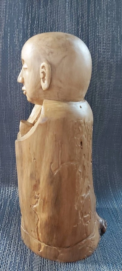 白楊木刻。原木已受歲月與白蟻部分侵蝕,但也巧妙的化為自然的紋理圖飾,正可以呼應人生體會。名曰「禮敬」