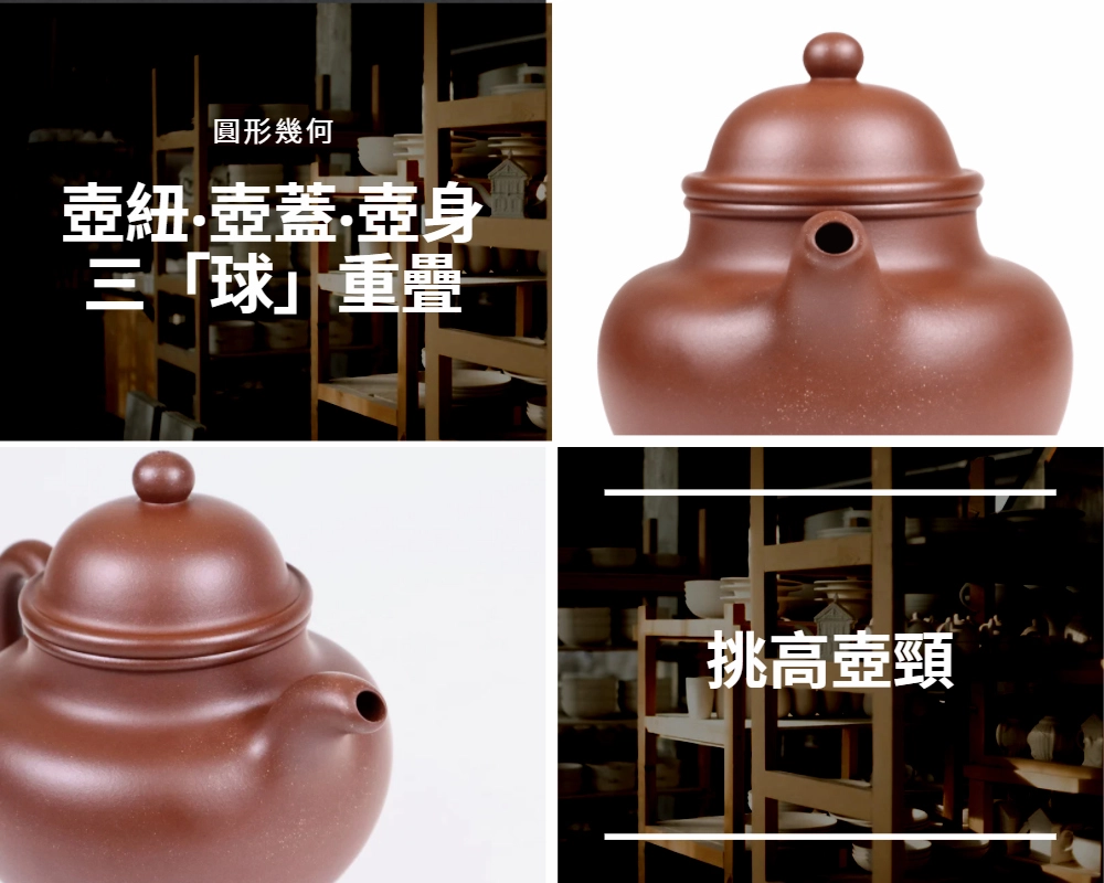 【說明】: 壺紐、壺蓋、壺身三「球」重疊,挑高壺頸,寬大壺口,密合實用。