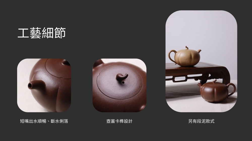 選用老紫泥製作,遠看表面光滑透亮,紫中透紅,近看保有紫砂原礦顆粒感。