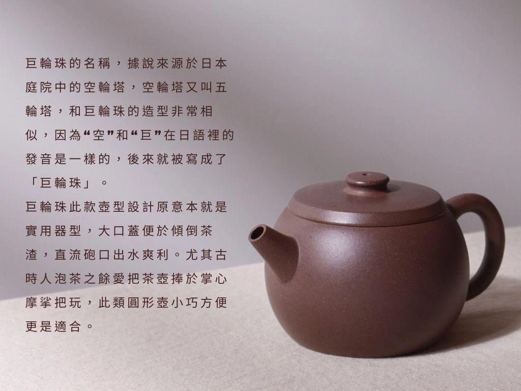巨輪珠此款壺型設計原意本就是實用器型,大口蓋便於傾倒茶渣,直流砲口出水爽利。