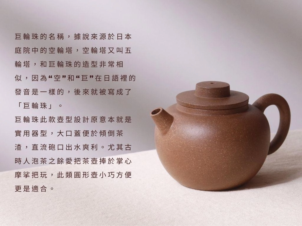 巨輪珠此款壺型設計原意本就是實用器型,大口蓋便於傾倒茶渣,直流砲口出水爽利。