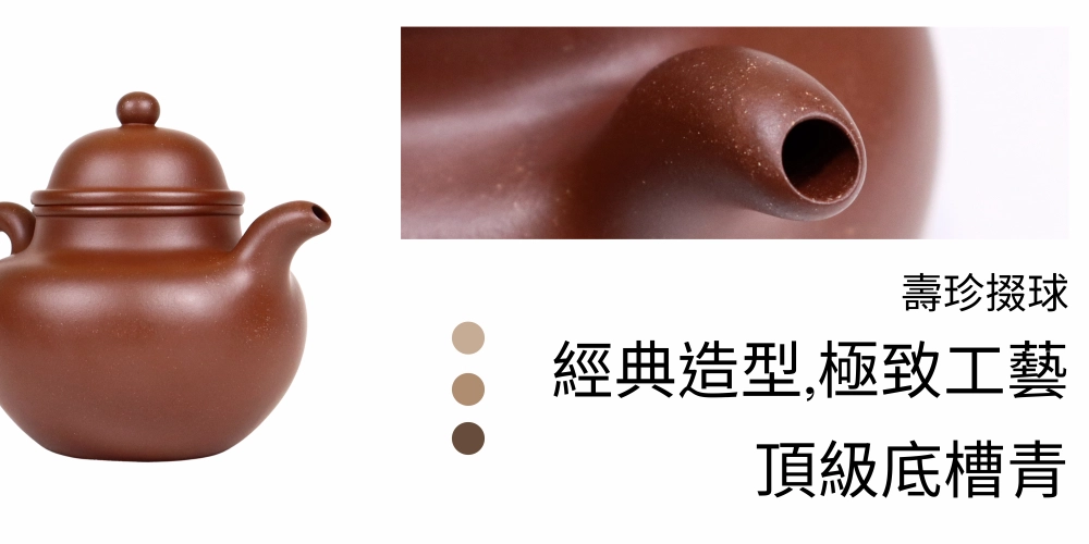 「壽珍掇球」是清末民國年間著名紫砂藝人程壽珍所做,他在「大亨掇球」與「友廷掇球」的基礎上更大膽的創新,壺身更圓更豐滿,壺口再放寬,壺頸挑高更顯精神充沛,壺蓋呈飽滿的半圓球,壺鈕圓珠適度放扁,在視覺上讓壺蓋的張力充分展開,壺嘴增加曲線的彎度,壺把在飄逸舒展中見好就收,形成了一個 「耳朵」形曲線的優美空間,各個部分比例協調,多一分則累贅,少一分則缺憾。