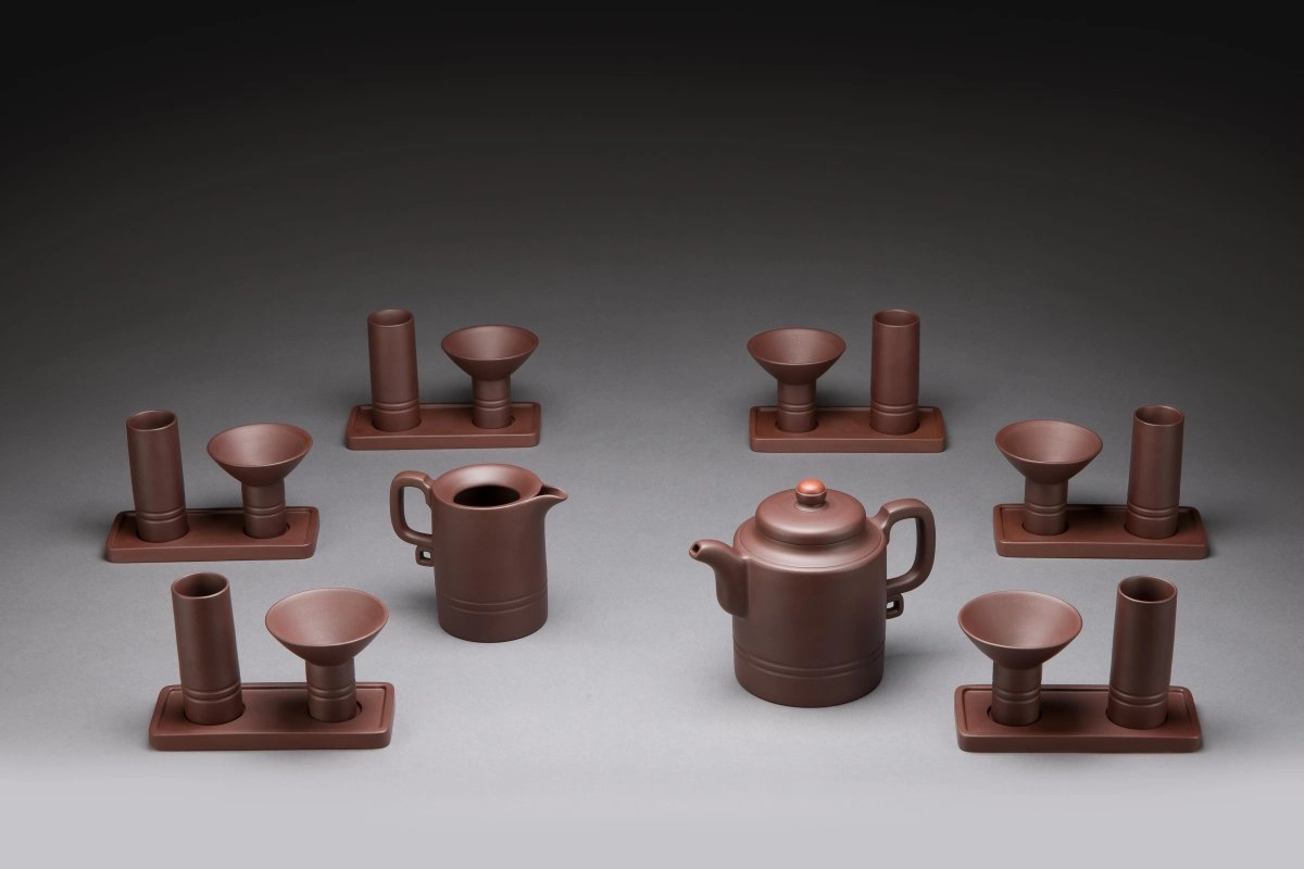 ⟪紫韻尊爵⟫壺組是林靖崧老師於2003年發表,發想自台灣烏龍茶藝文化。台灣人品茗除了壺︑杯,另備有聞香杯與公倒杯,當喝茶不再僅止於解渴之實用用途,而晉升為一種文化活動時,令人心曠神怡的茶香氣及濃淡溫度一致的茶湯,遂成為品茗中不可或缺的兩個環節。