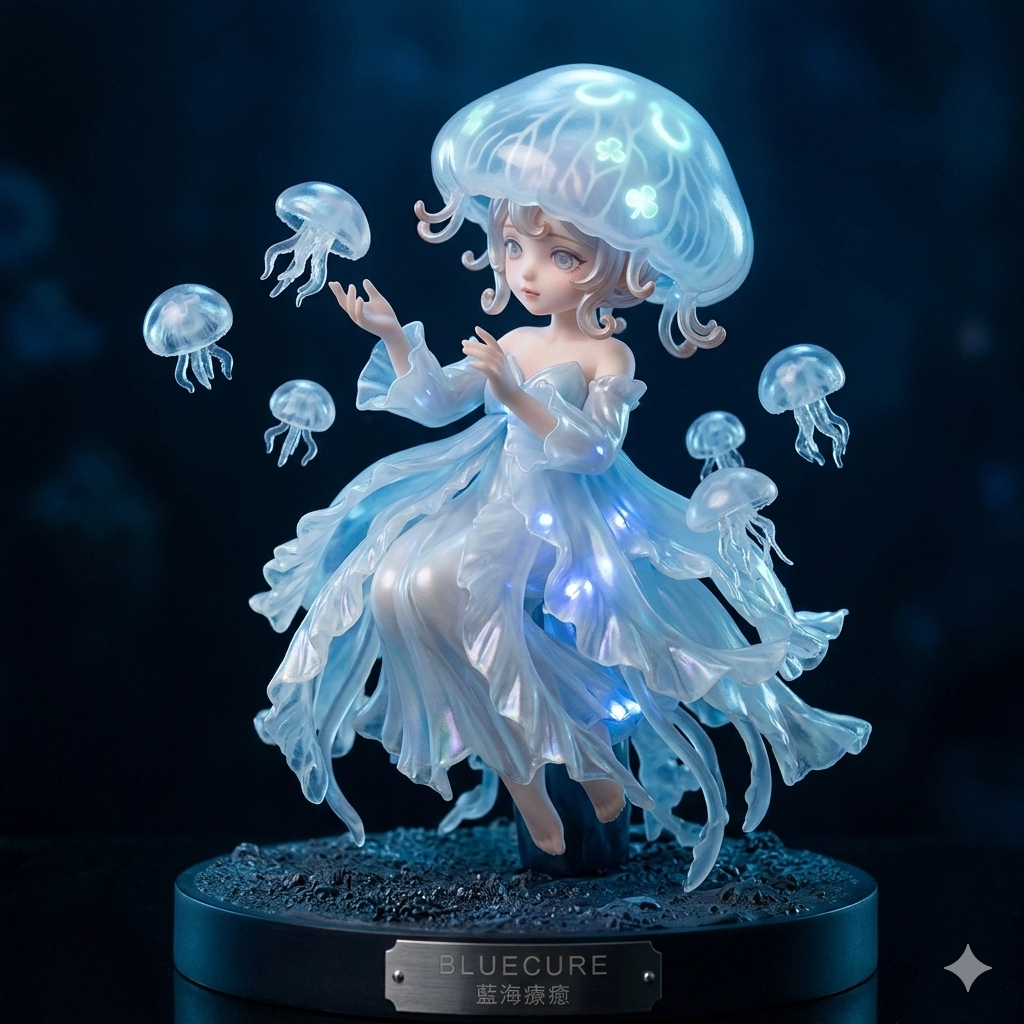 這款公仔將水母的生物特徵轉化為優雅的女性形象,第二張為原圖,主要特徵為半透明的材質美學、深海光影的捕