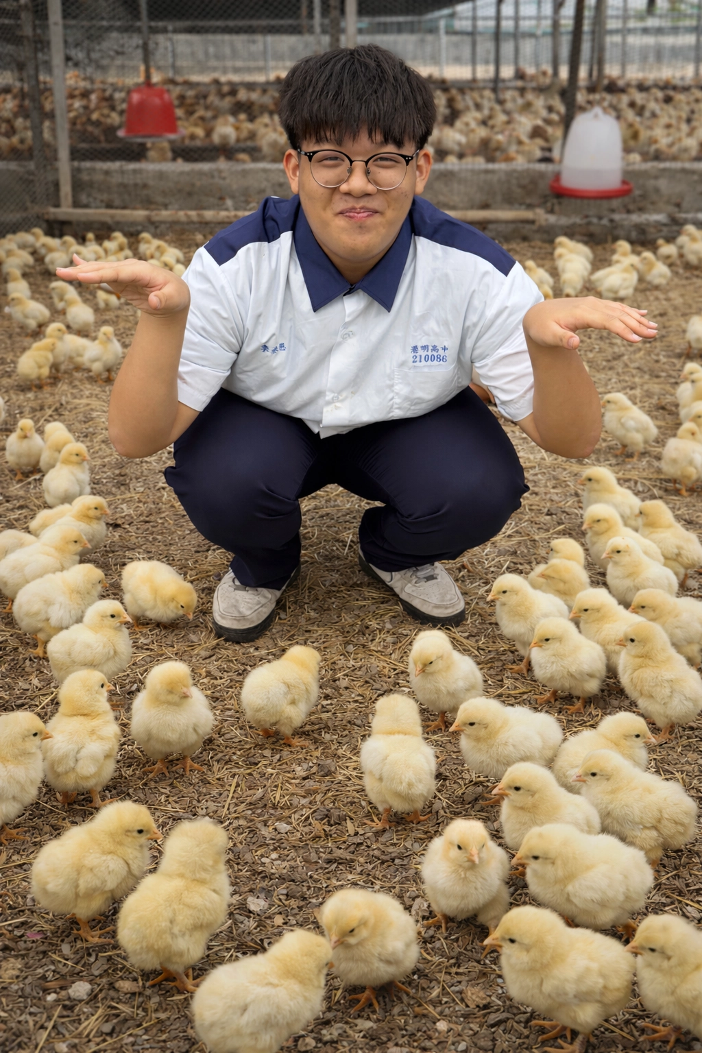 幫我把背景改成養雞場把其他的人的腳去掉在中間那個人周圍放一群小雞再幫我把中間那個人做成公仔動作不要變