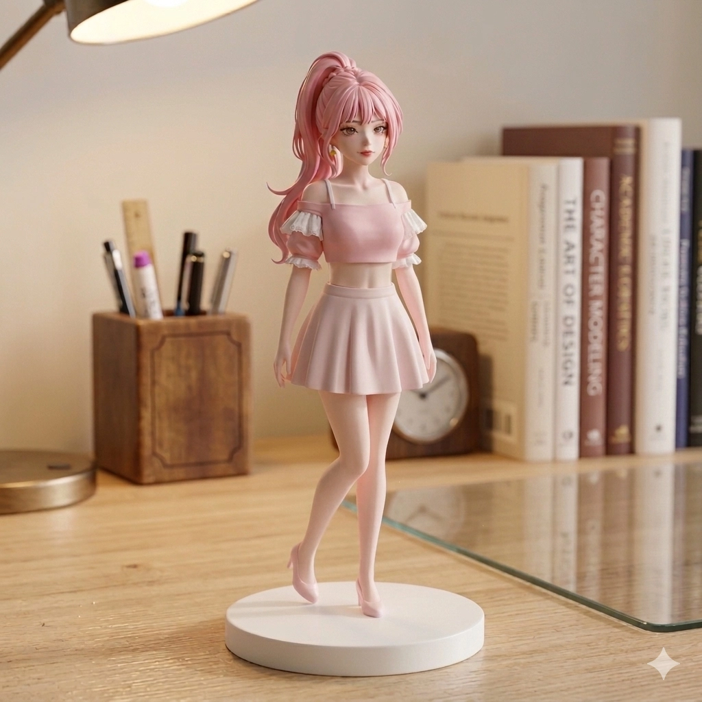 請幫我把立繪變成全身圖,下身穿淺粉色的A字裙露臍裝,站立型態右腳微屈帶點俏皮感,並製作成立體公仔,白