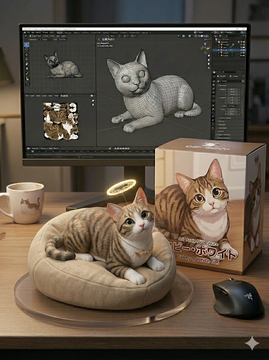 指令:請用我提供的原圖,把圖片內主體變成電腦桌前的立體公仔。場景為一張電腦書桌,上面擺放著一個1/7