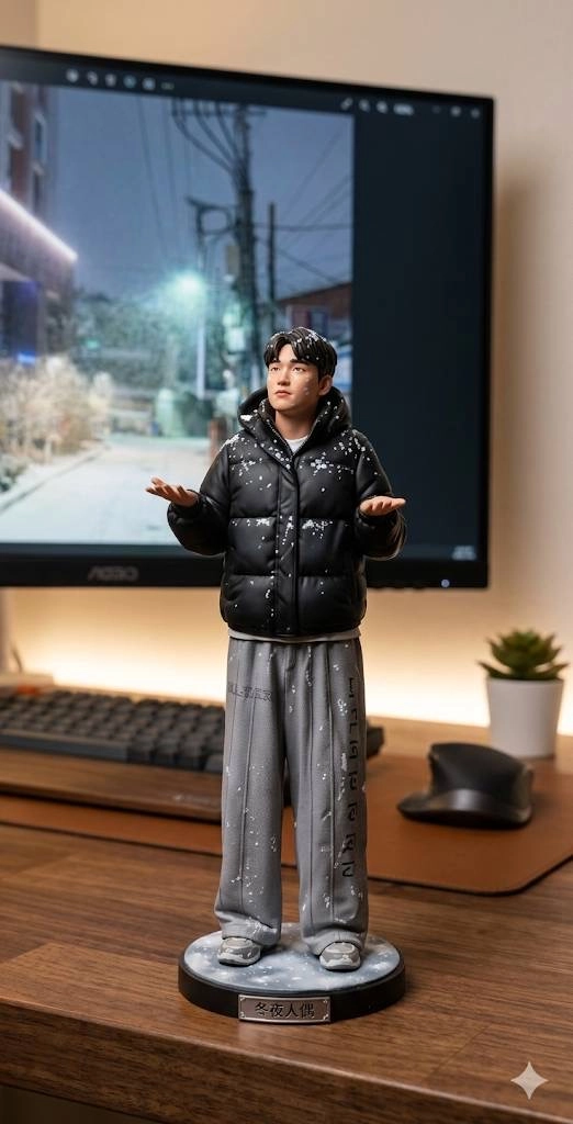 請用我提供的原圖,把圖片內主體變成電腦桌前的立體公仔。場景為一張電腦書桌,上面擺放著一個1/7比例的