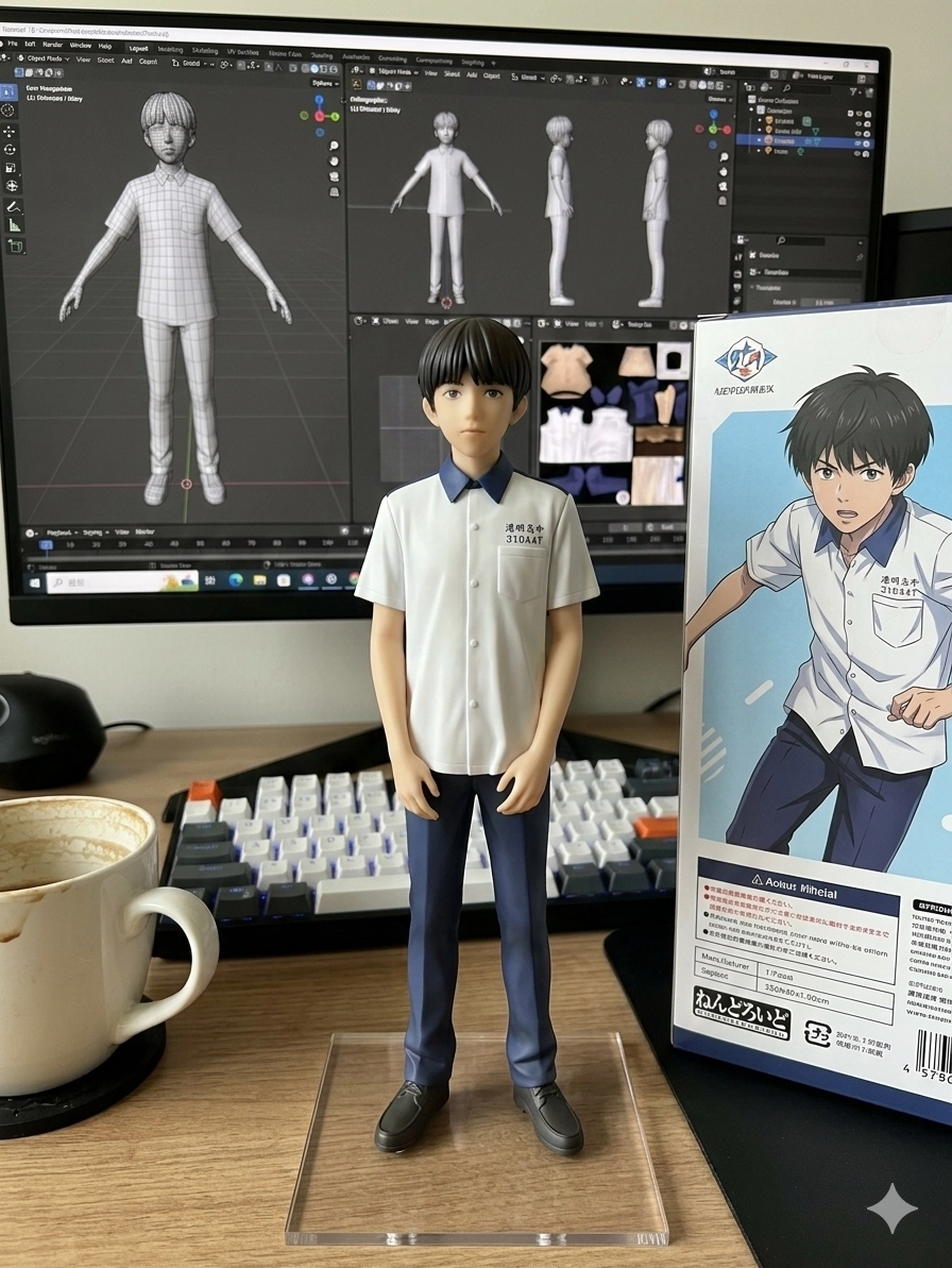 請用我提供的原圖,把圖片內主體變成電腦桌前的立體公仔。場景為一張電腦書桌,上面擺放著一個1/7比例的