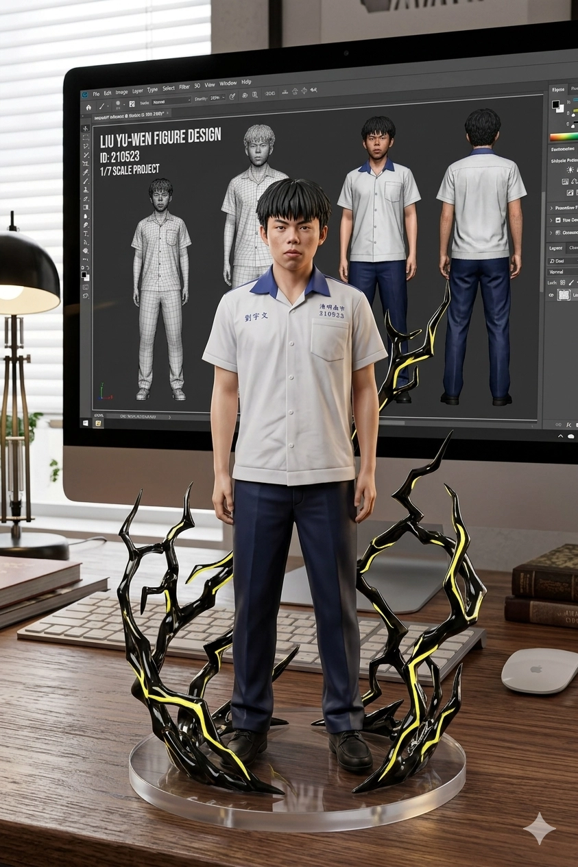 幫我把這張照片生成立體公仔的樣子把圖片內主體放在電腦前。場景為一張電腦書桌,上面擺放著一個1/7比例