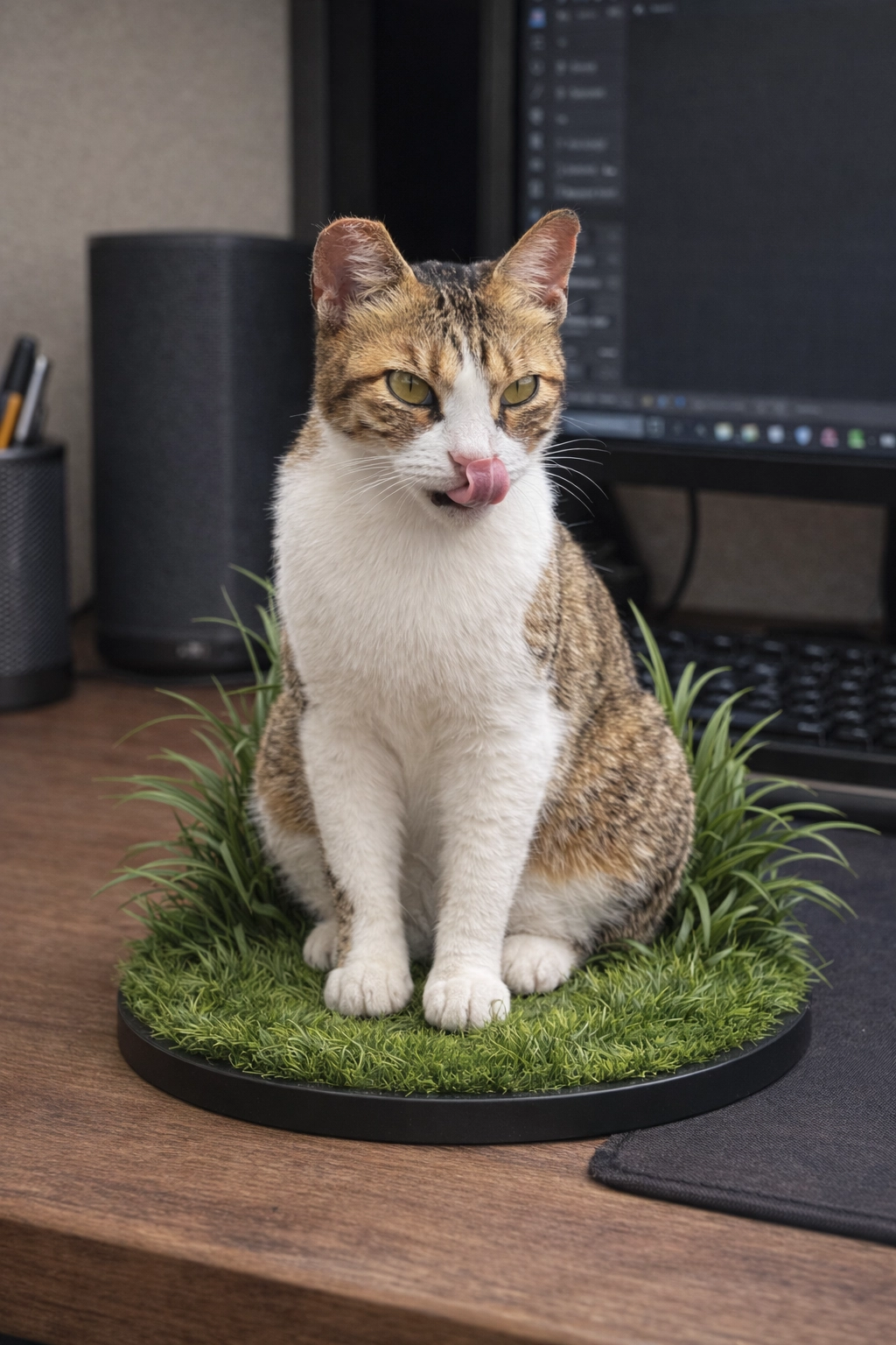 請把這張圖轉變成公仔盡可能還原各種細節底座要是草叢公仔要放在桌子上