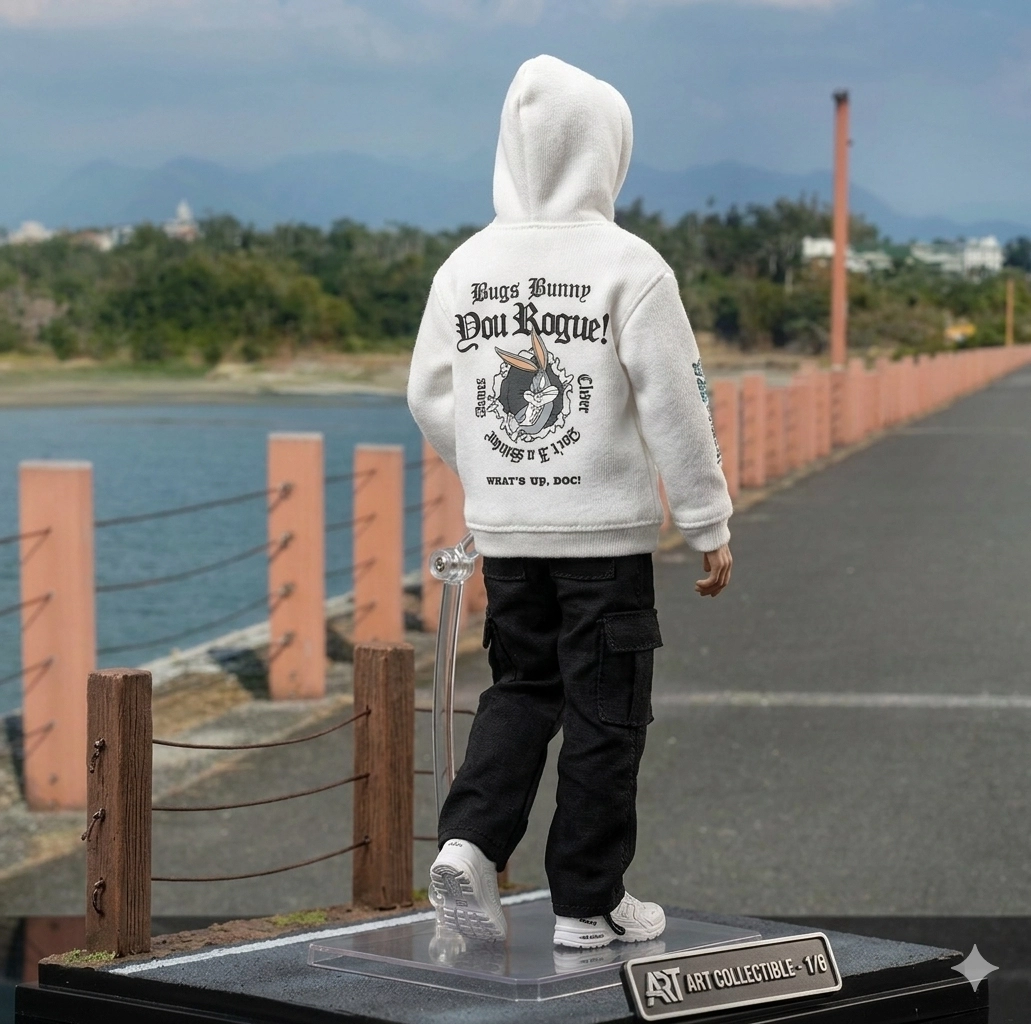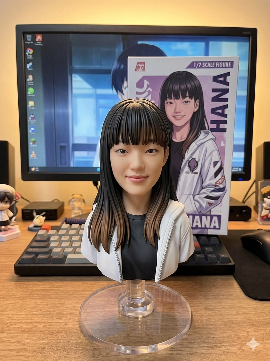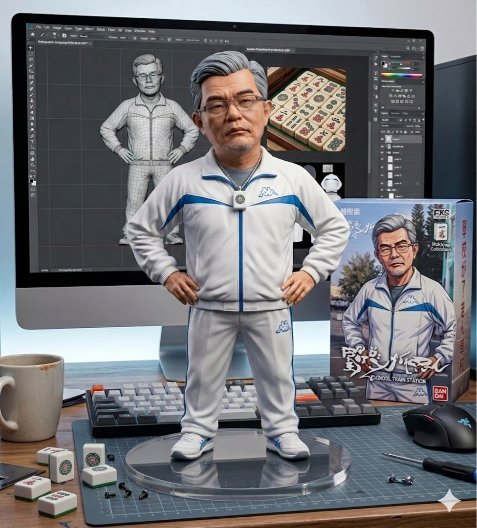 請用我提供的原圖,把圖片內主體變成電腦桌前的立體公仔。場景為一張電腦書桌,上面擺放著一個1/7比例的