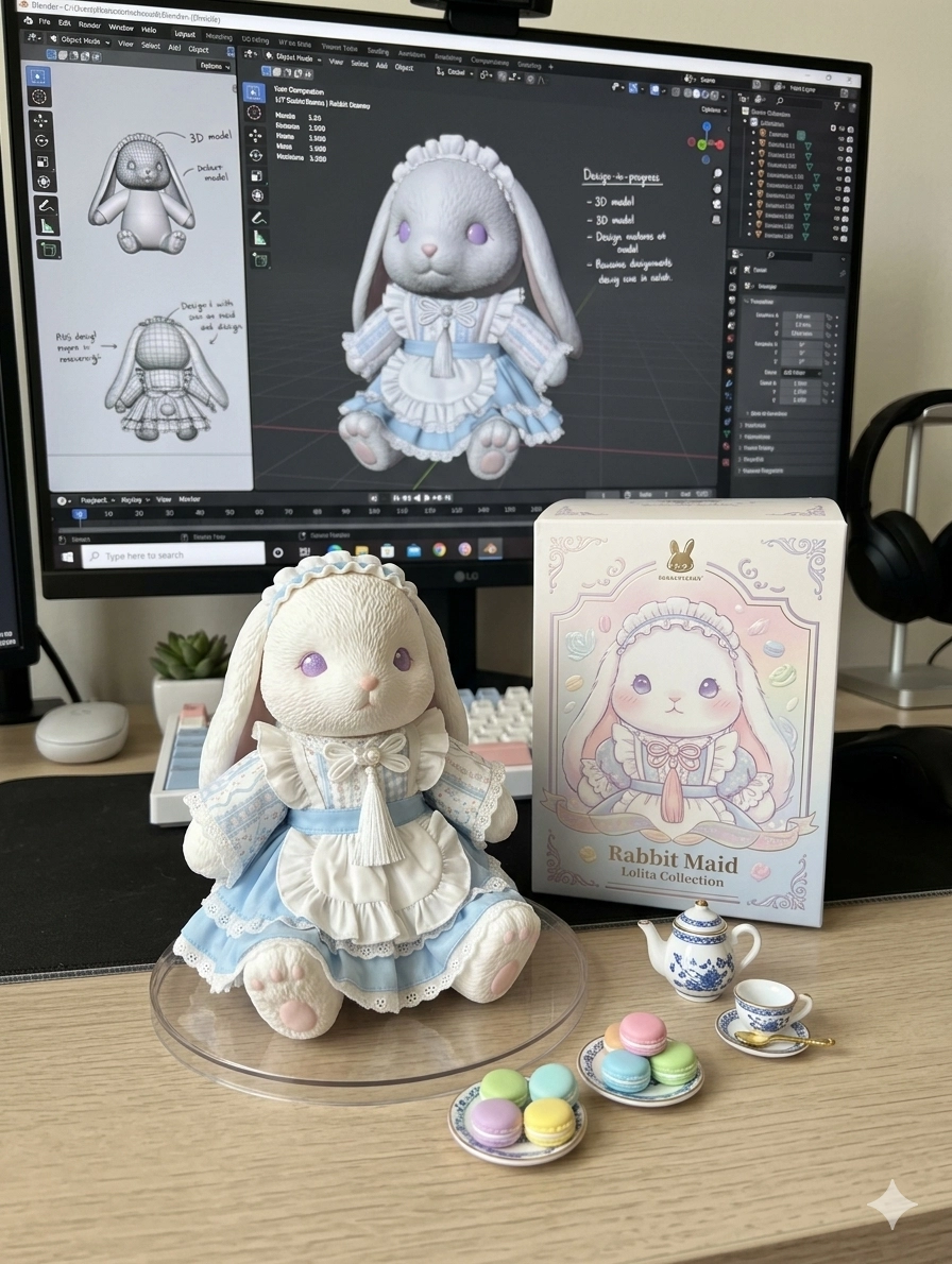 大餅公仔這張圖展現了一個完整的「開箱與開發」情境。畫面中心是比例1/7的精緻公仔,身穿經典的白色Ka