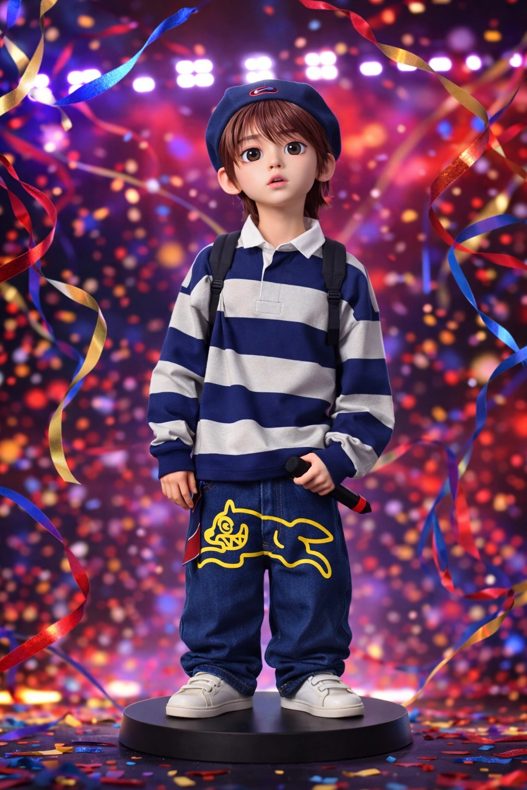 幫我做成3D公仔,背景用舞台的然後有彩帶在飄的那種