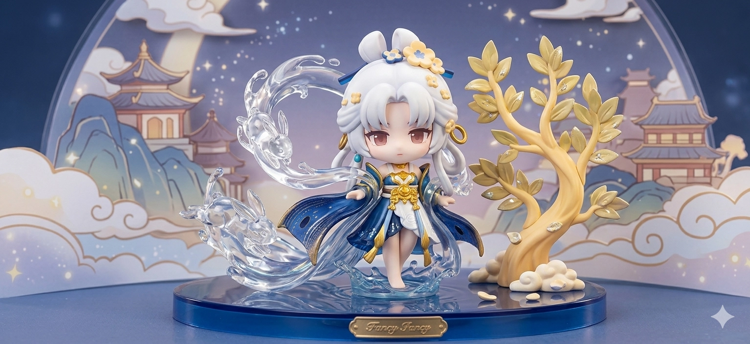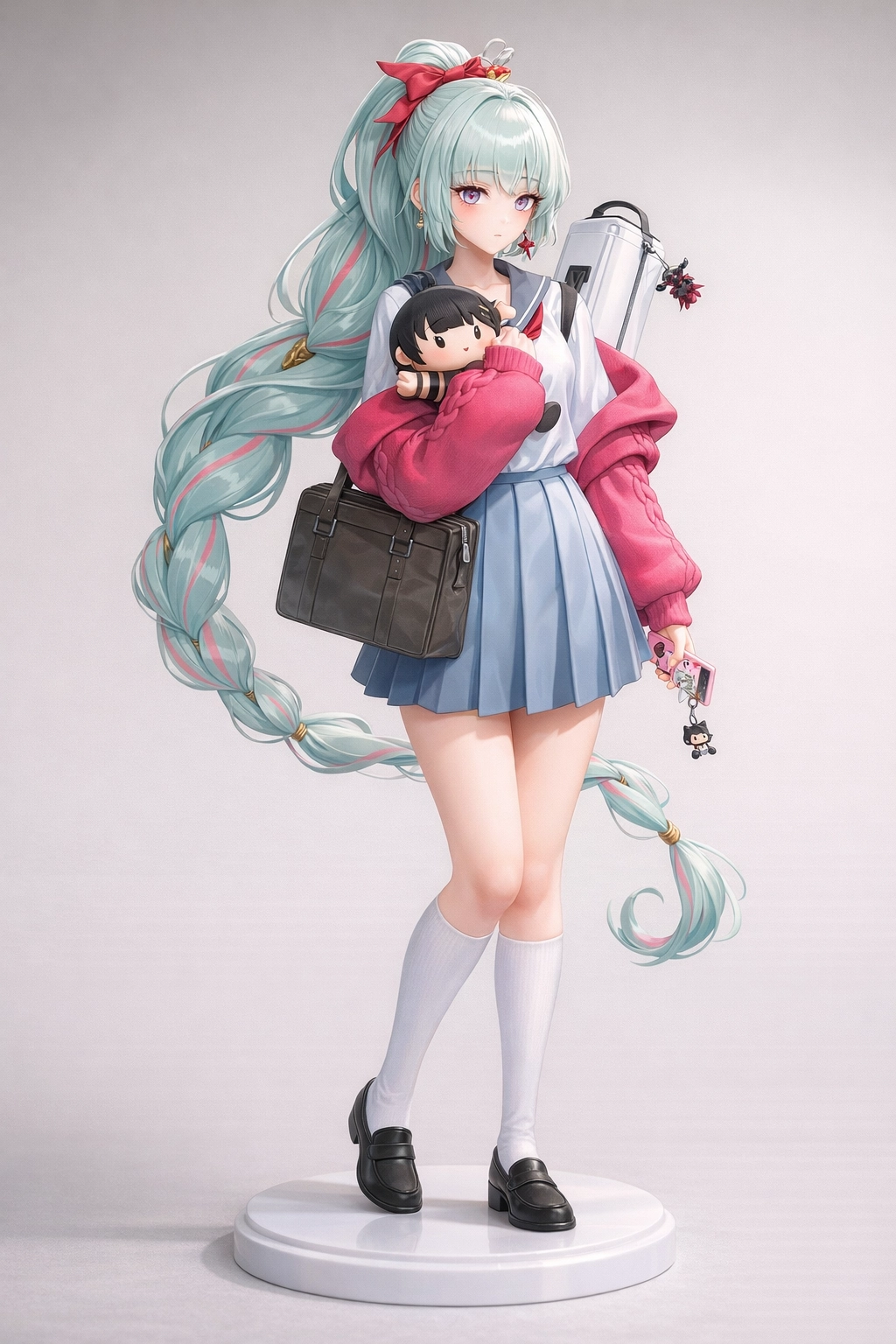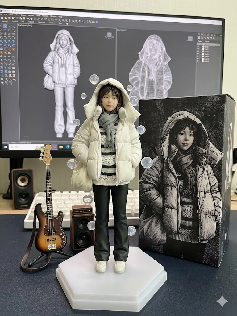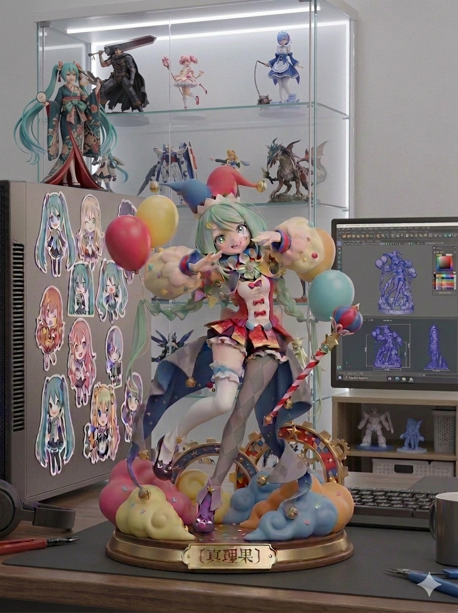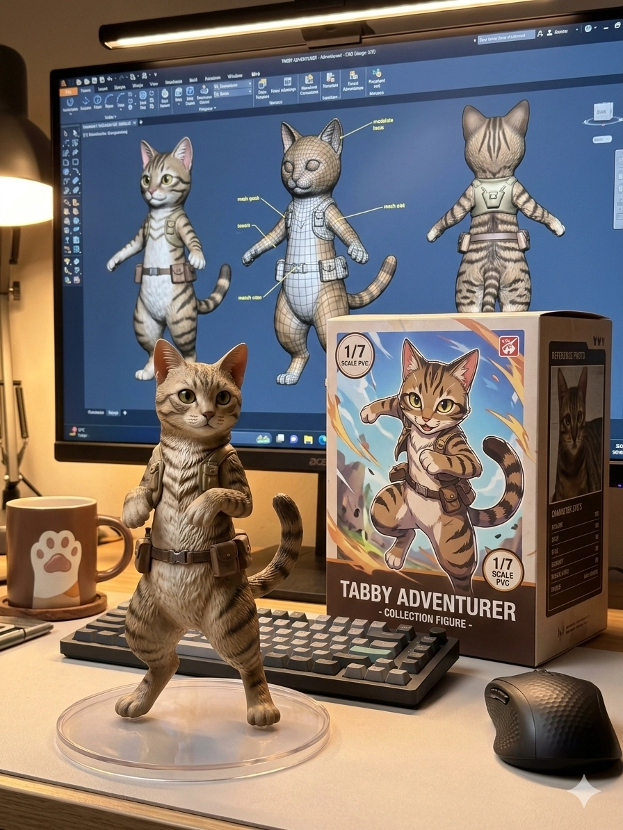 請用我提供的原圖,把圖片內主體變成電腦桌前的立體公仔。場景為一張電腦書桌,上面擺放著一個1/7比例的