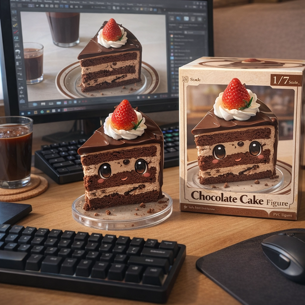這件作品以日常生活中的甜點為靈感,將原本真實存在的巧克力蛋糕轉化為具有收藏價值的立體公仔形象。畫面中