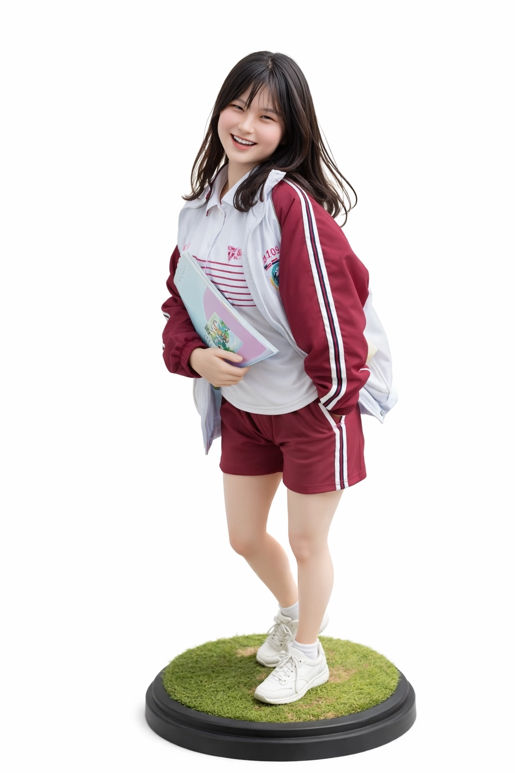 請用我提供的原圖,把圖片內主體變成海邊的立體公仔。場景海邊,上面擺放著一個1/7比例的PVC公仔,角