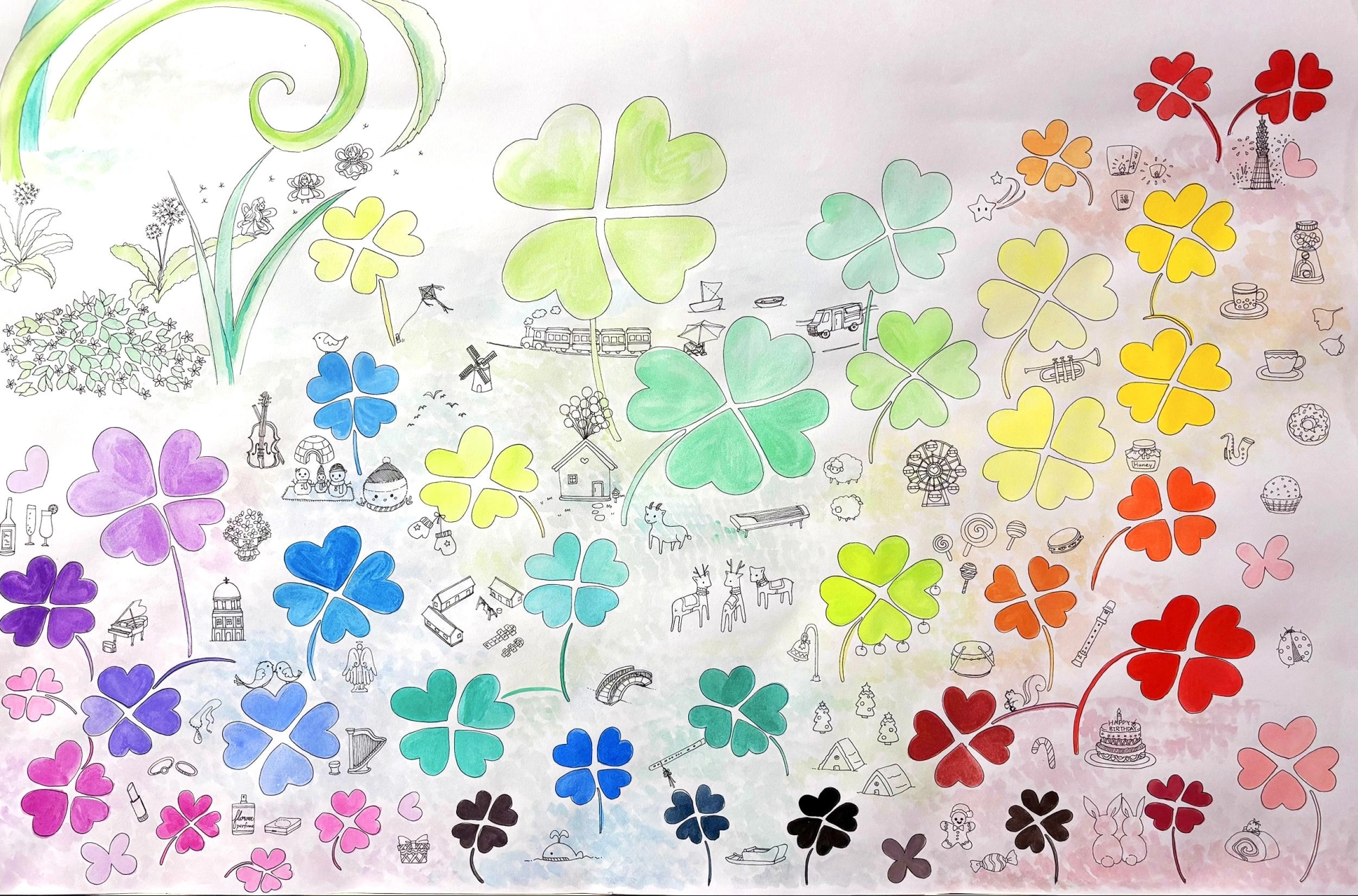 材料粉彩餅+代針筆「小日子裡的日常小事,交織成彩虹色的幸運日記,塗鴉式的童趣尺度,誰比誰大、誰又比誰