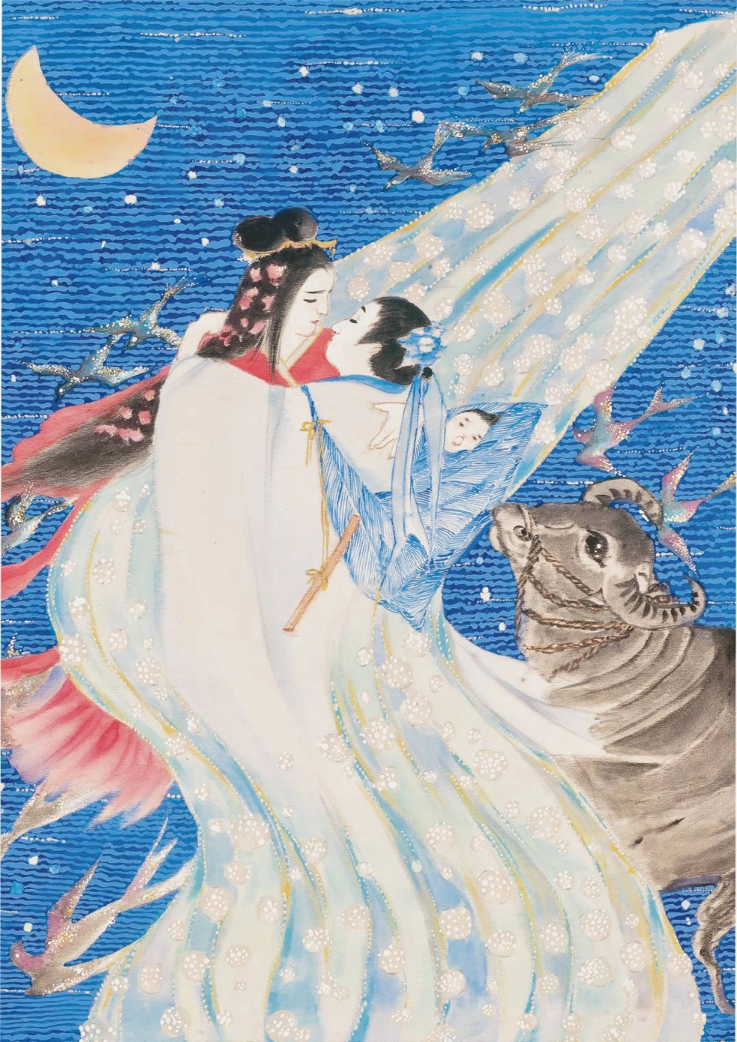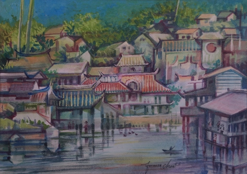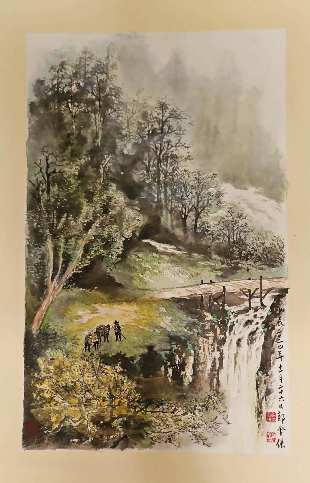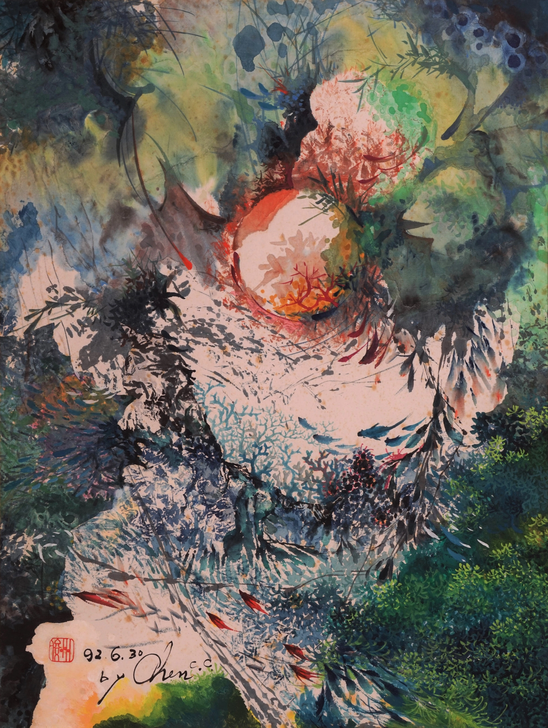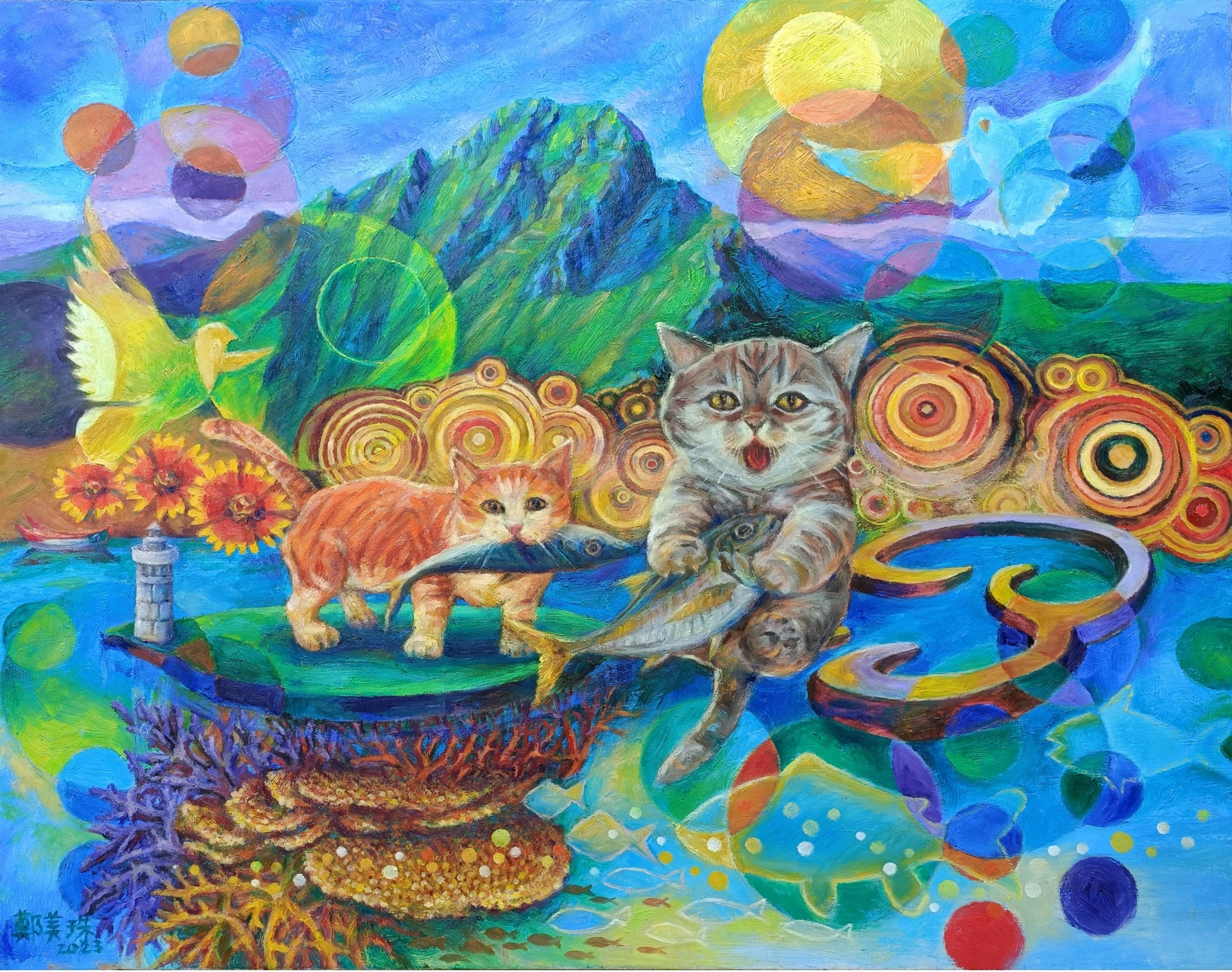 大山嗨翻大海(油畫30F),以台灣玉山、雙心石滬、白鳥、雙貓咪、抓魚和澎湖紋石等元素為主軸的心象風景