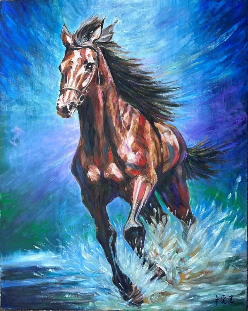作品說明:以奔馳的駿馬為主題,象徵勇氣、力量與卓越領先。畫面展現馬匹奮力前行,躍水而過的動感,傳達突