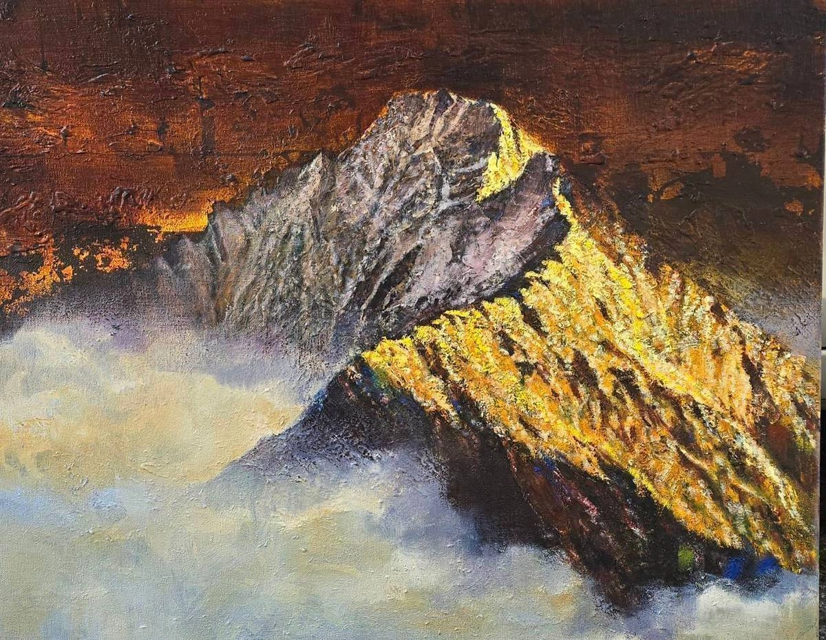 蒼茫玉山(油畫30F2025)橫視是連綿的崇山迤邐側視又是高聳的削壁巉巖可以瞬間撥雲弄霧又瞬間氤氳滿