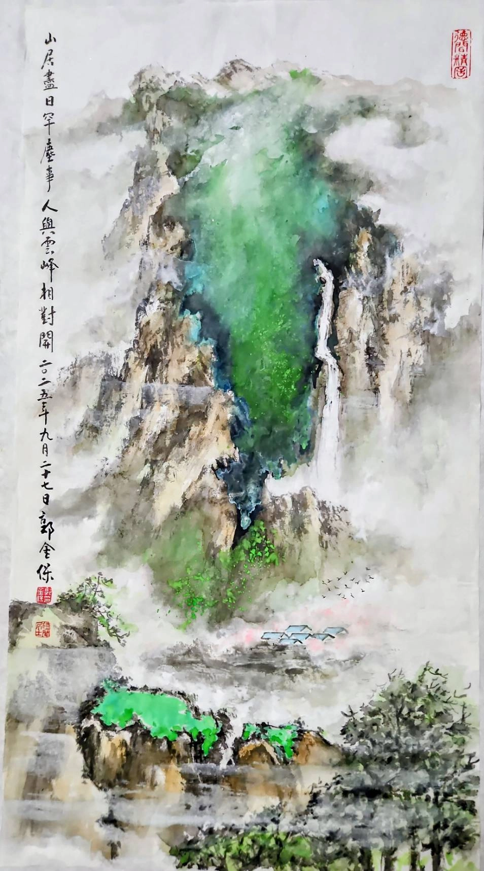 精神好,早起習畫完成《山居圖》山居盡日罕塵事.,人與雲峰相對開二O二五年九月二十七日郭金保