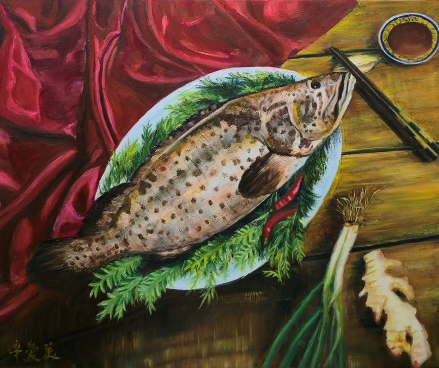 題目:來自海洋的佳餚-澎湖石斑規格:20F(72.5×60.5cm)媒材:油畫創作年代:2025創作