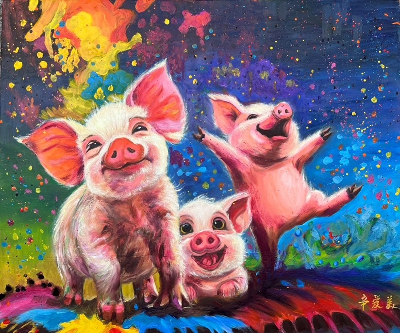 題目:快樂頌規格:20F(72.5×60.5cm)媒材:油畫創作年代:2025作品說明:三隻可愛小豬