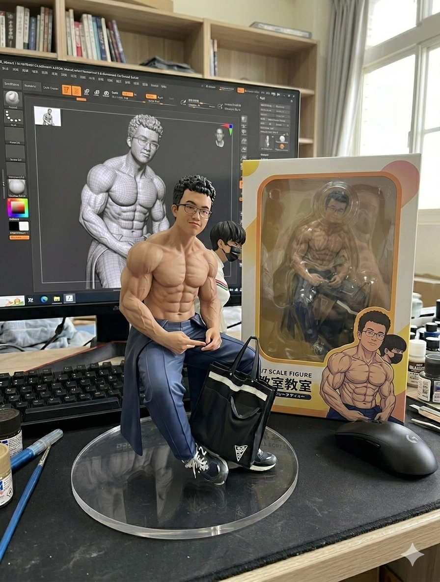 請問可以幫我生成出公子的樣子嗎?然後幫我把後面變成秋葉原的樣子要把我變成公仔的樣子而且要把後面的泥土