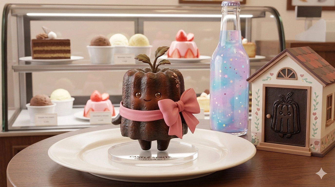 請用我提供的原圖,把圖片內主體變成盤子上的可麗露小精靈。場景為一張餐桌上的盤子,上面擺放著一個1/7