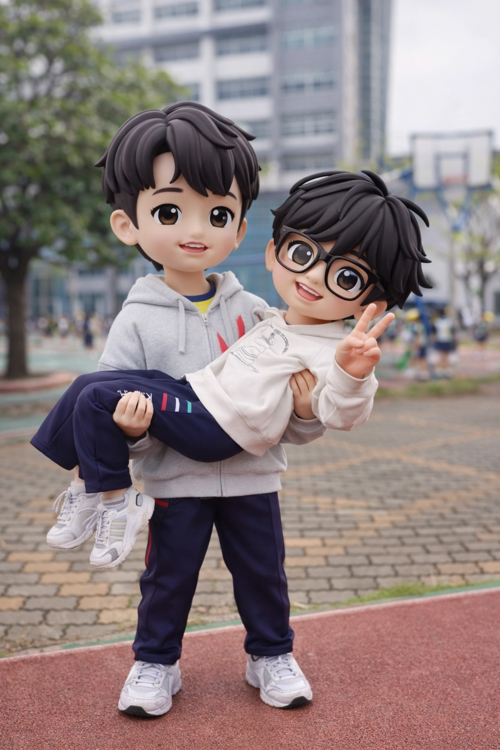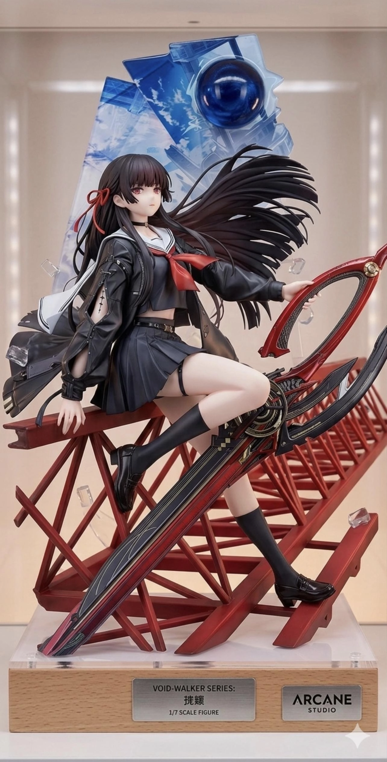 請用我提供的原圖,把圖片內主體變成電腦桌前的立體公仔。場景為一張電腦書桌,上面擺放著一個1/7比例的