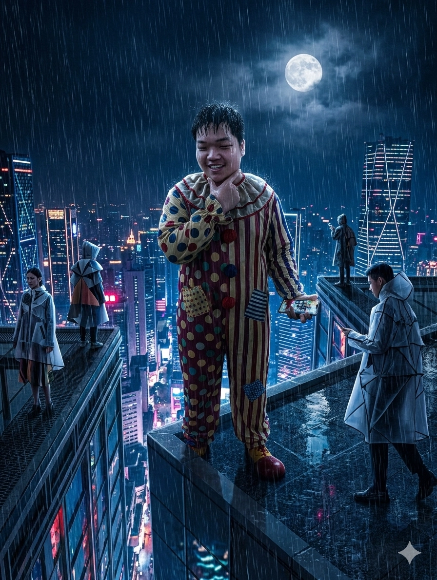 請用我提供的原圖,背景夜月高峰的城市大樓中,行人穿著抽象的風格外衣挺直的站在最高的樓層上下著大雨照片