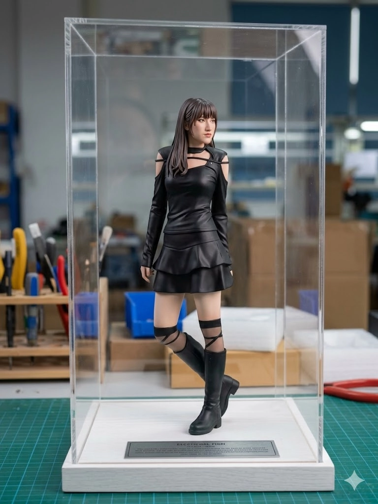 請將圖片都狗做成一個公仔,場景為展示櫃裡,展示櫃有燈條,旁邊有公仔的盒子
