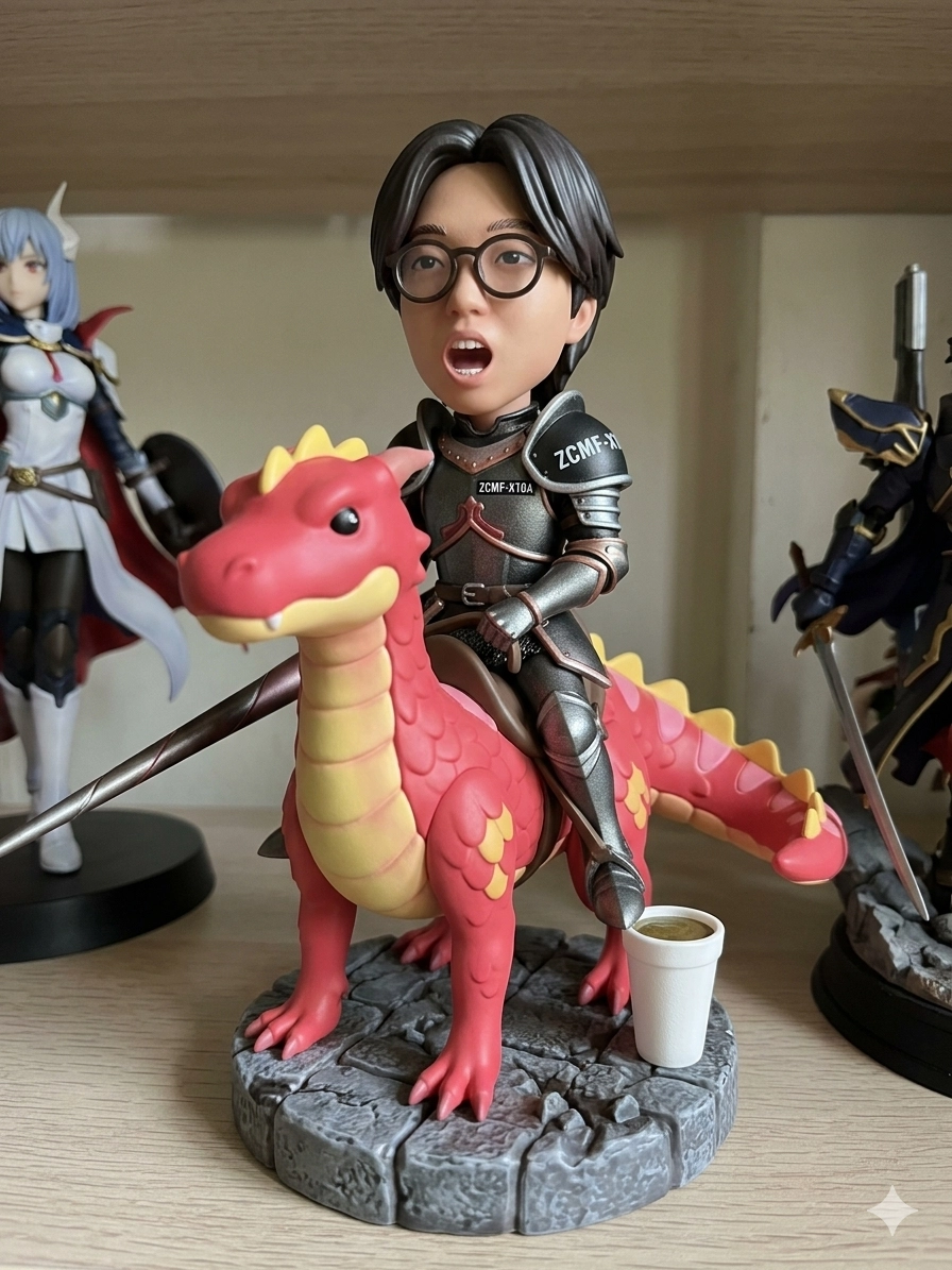 幫我生成一個龍騎士樣貌的公仔人物不變龍的顏色不變盡量維持人物表情