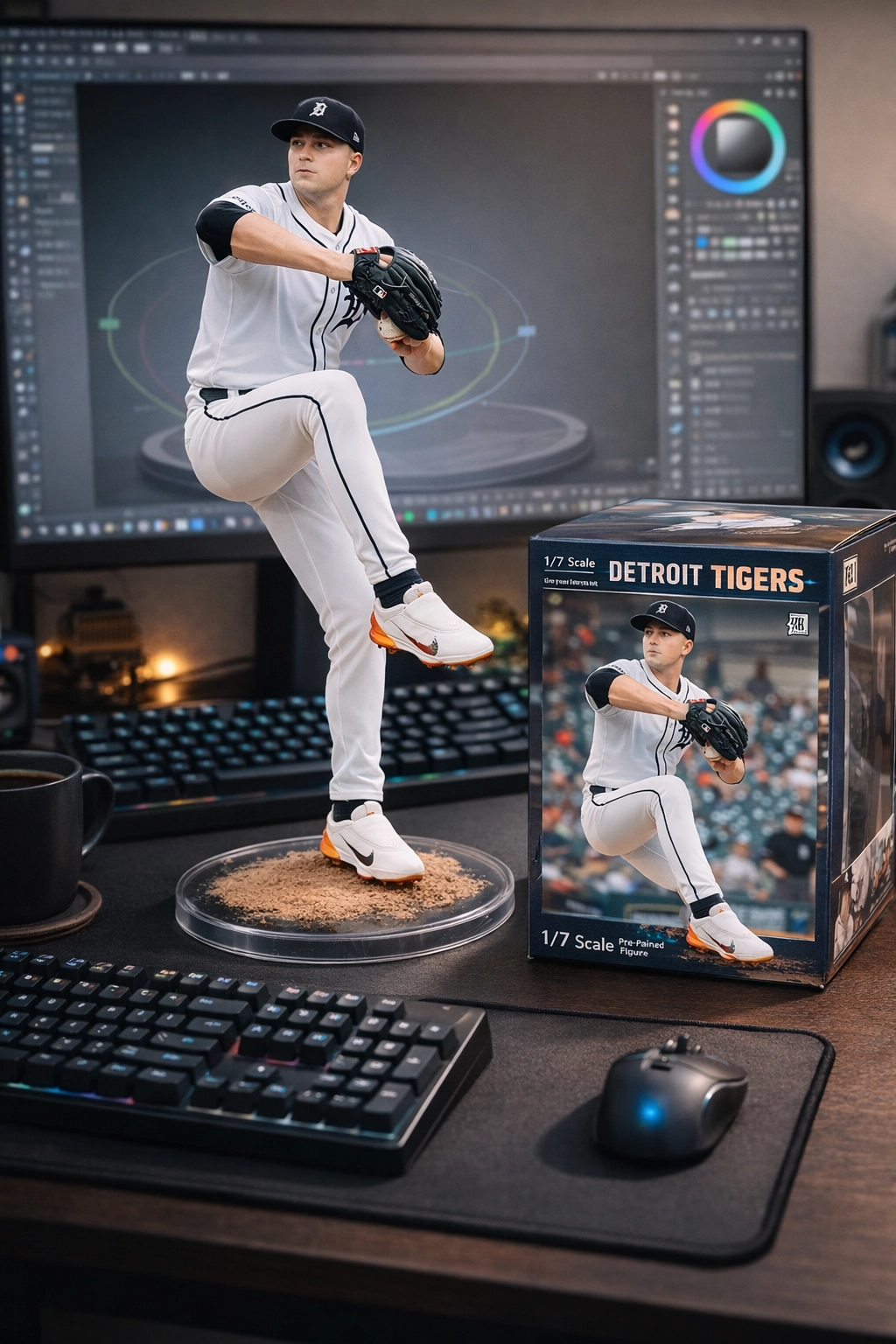 請用我提供的原圖,把圖片內主體變成電腦桌前的立體公仔。場景為一張電腦書桌,上面擺放著一個1/7比例的