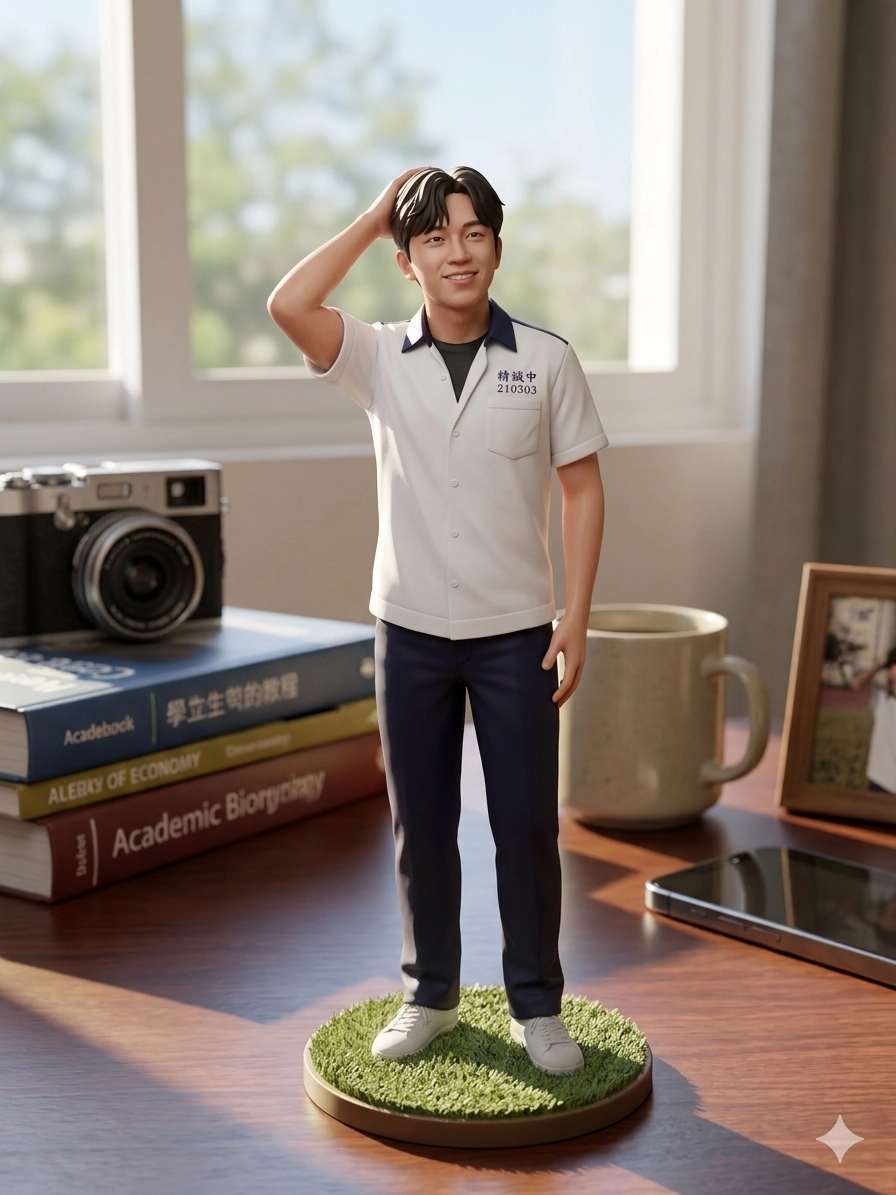 「請用我提供的原圖,把圖片內主體變成電腦桌前的立體公仔。場景為一張教室書桌,上面擺放著一個1/7比例
