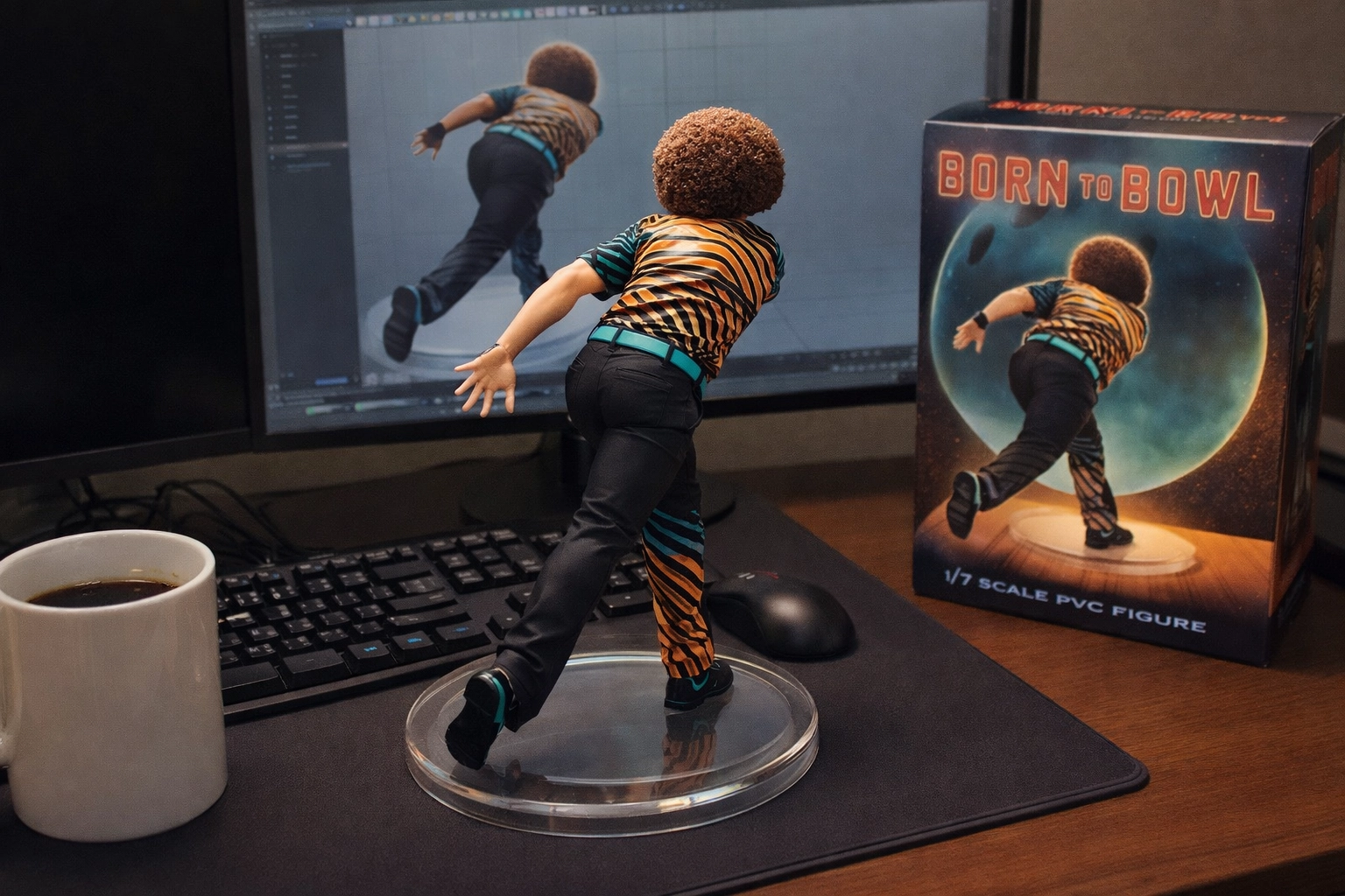 請用我提供的原圖,把圖片內主體變成電腦桌前的立體公仔。場景為一張電腦書桌,上面擺放著一個1/7比例的