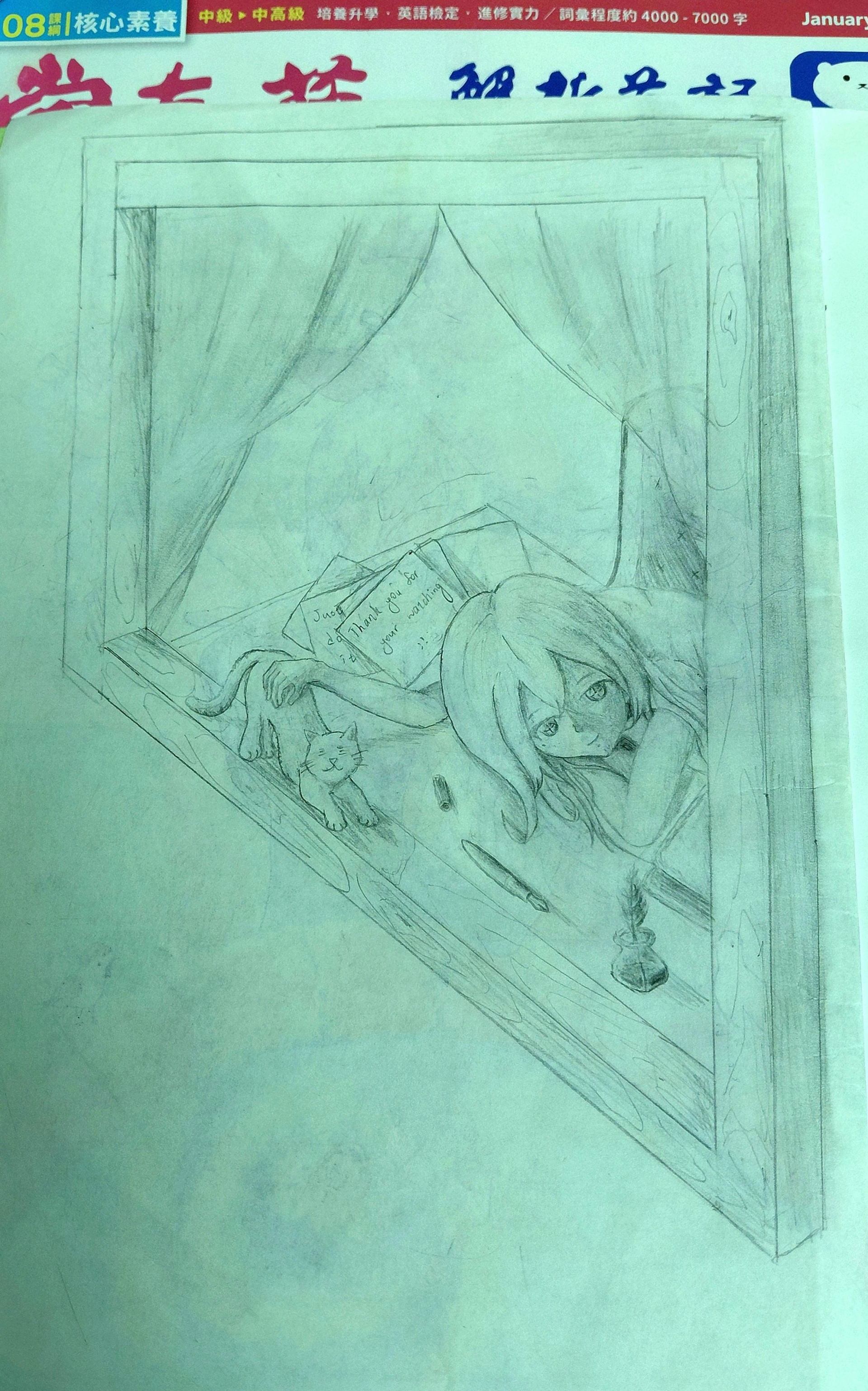 這是一份鉛筆畫,希望能帶給各位一種安靜的感覺。架構上我並沒有認真去探究透視,並使用了莫比烏斯環在窗框