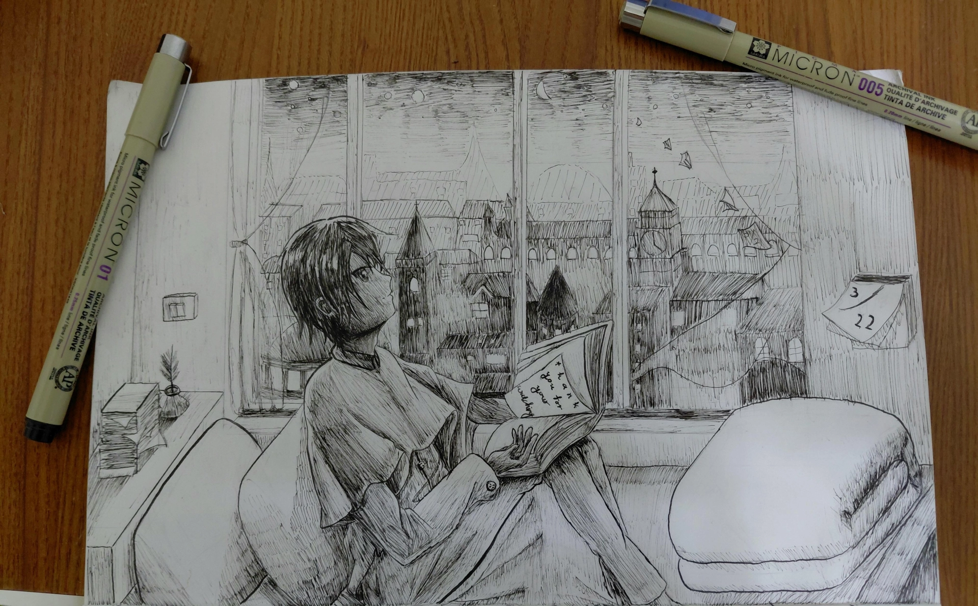 這是一份代針筆畫,我用了0.05的筆慢慢勾線,把這幅作品勾勒出來。這份作品中,我想表達夜還有很長的感