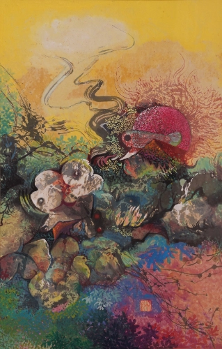 創作理念:繪畫多年希望能融入自己的風格,創造出詮釋的方法,畫裡要有裝飾性,但不是裝飾畫。融合中西貫穿