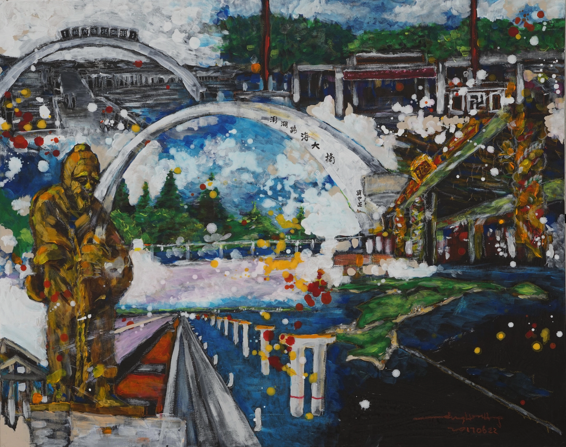 複合媒材(澎湖縣政府文化局收藏)【跨海大橋】此畫是吾人在2017年前後,嘗試以重複曝光的手法展現寫實